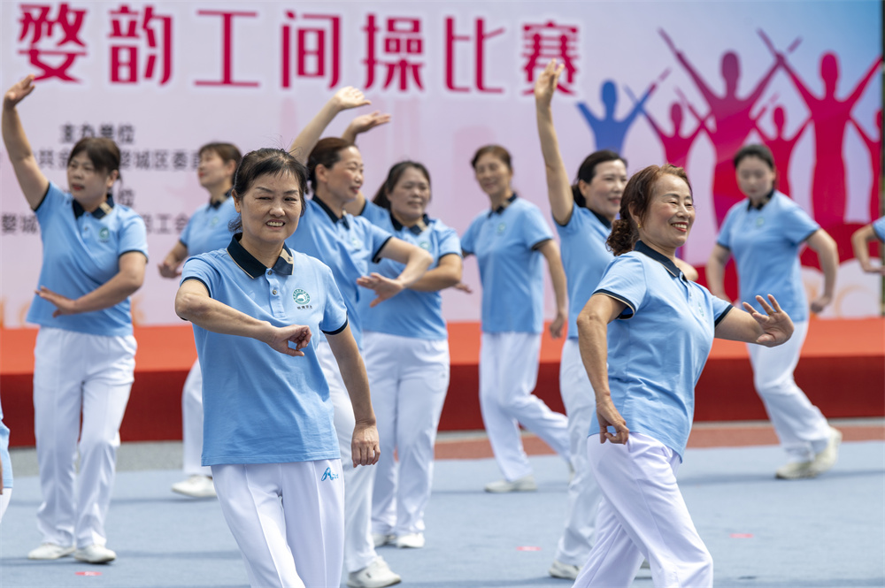 5月13日,婺城区职工在金华市古子城广场参加“婺韵工间操”比赛。