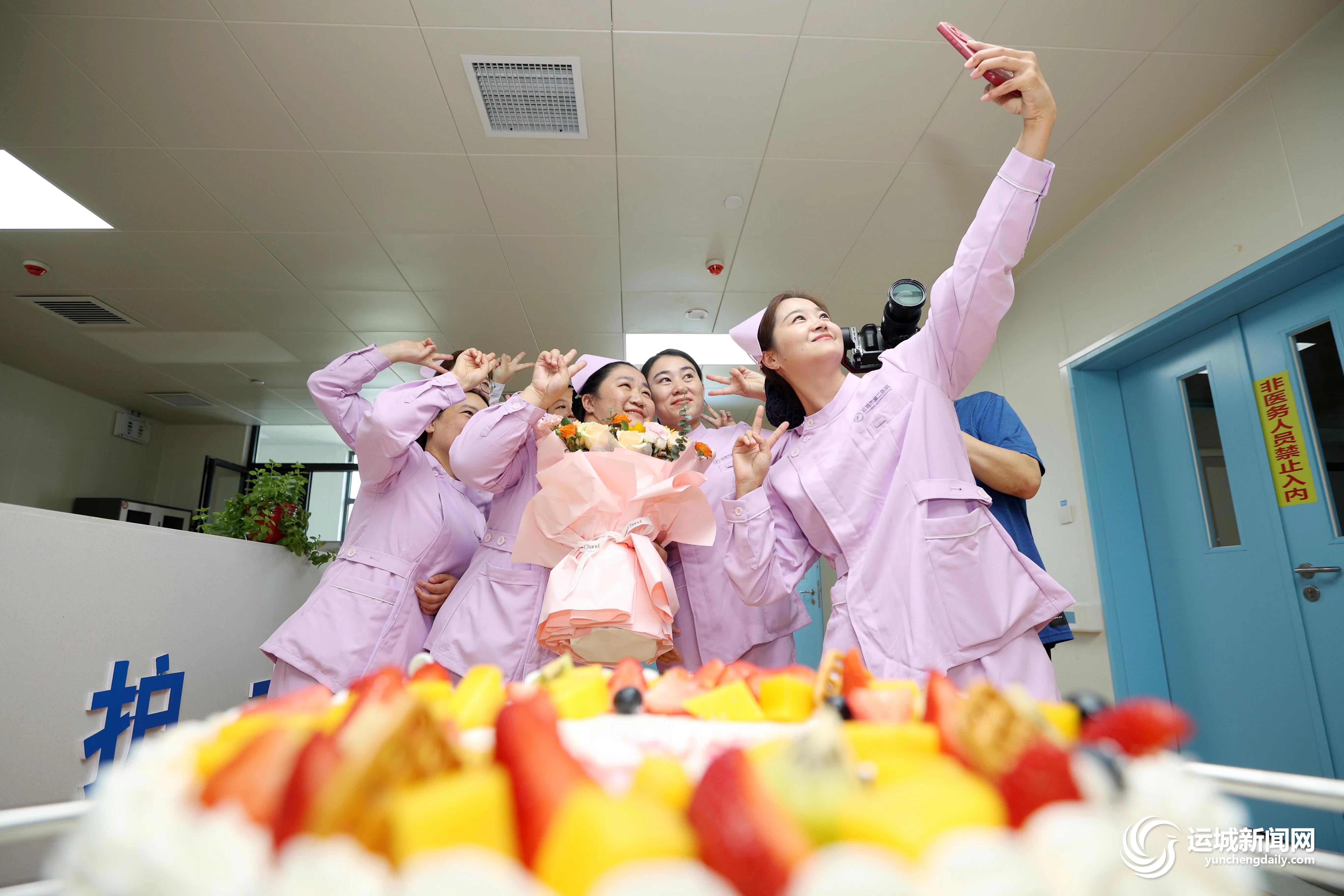 5月10日,运城市第二医院护士在活动中拍照留念。当日,该医院举办“鲜花蛋糕送天使”护士节慰问走访活动,关心关爱一线护士,提升护理人员幸福感。 记者 景冬波 摄