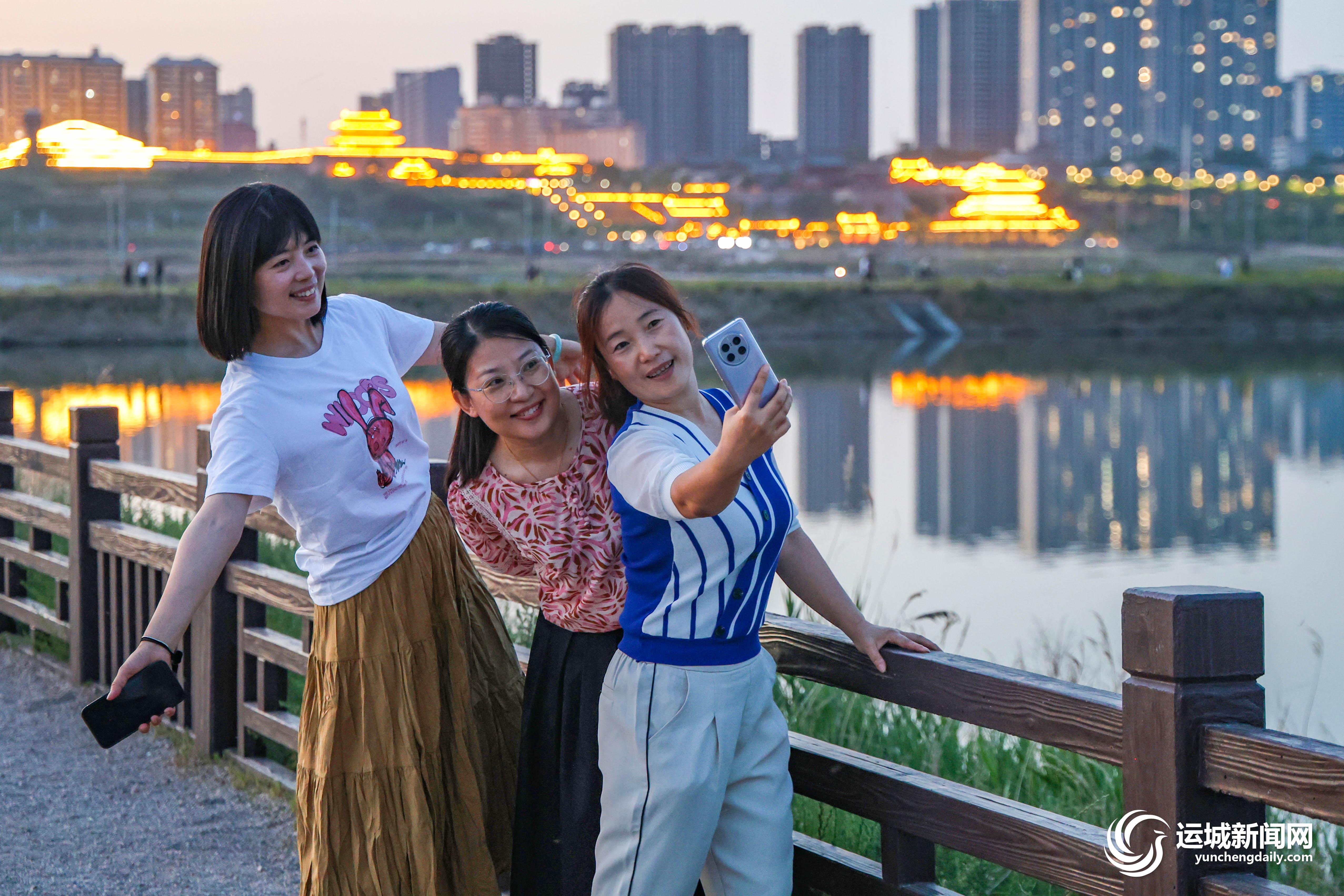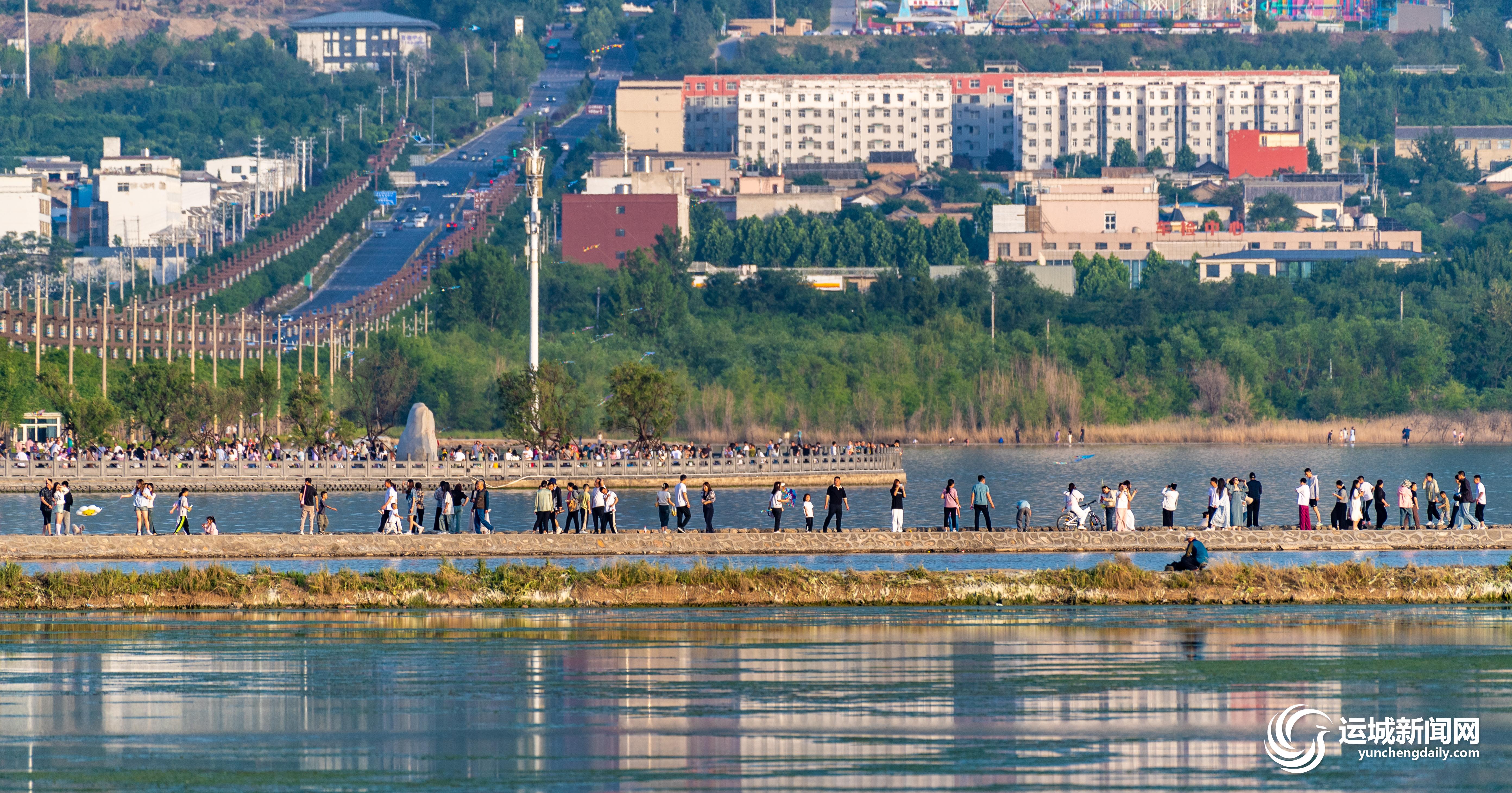 初夏阳光和煦,环湖大道上,不时有自行车队伍穿过盐池,一路上微风拂面,候鸟漫舞、湖光潋滟的美景随着骑行尽收眼底;盐池广场上,和风送纸鸢,孩子们拉着风筝线尽情奔跑,大人们轻松惬意,聆听盐湖与风的低吟;位于解放南路跨湖段东侧的006号灯杆,被众多市民和游客称作“盐湖拍照最出片的地方”,人们三两好友相互作伴,在这里为彼此留下最美的照片;傍晚时分,盐湖22号堤埝人气火爆,市民们环湖漫步,赏盐池落日美景,看城市华灯初上。
