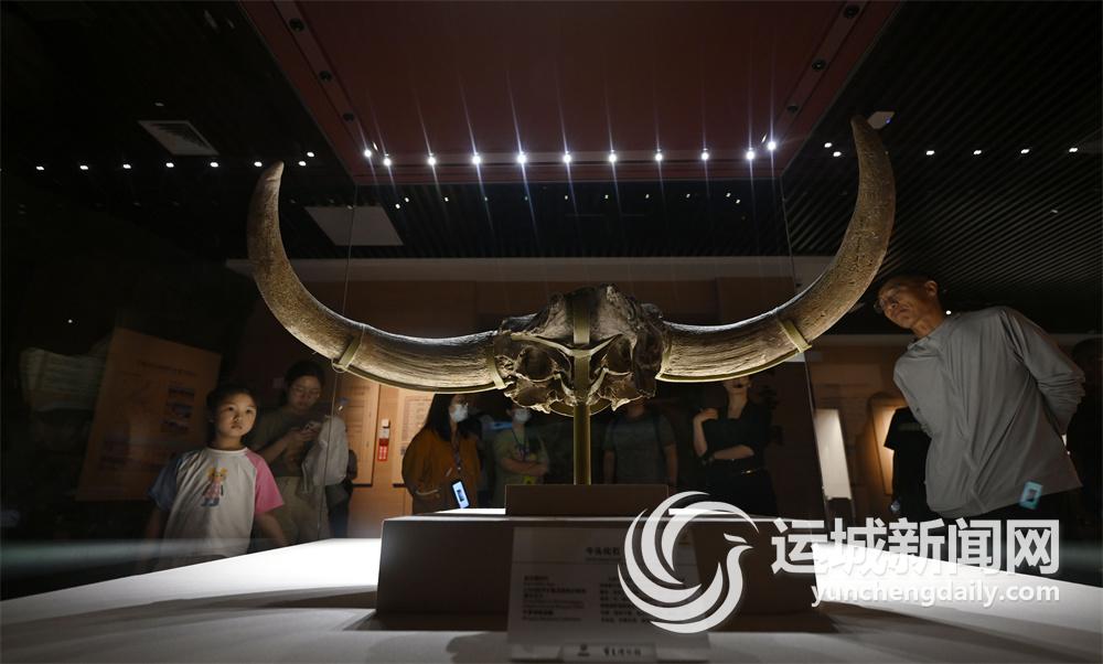 游客在宁夏博物馆欣赏展出的牛头化石(5月14日摄)。