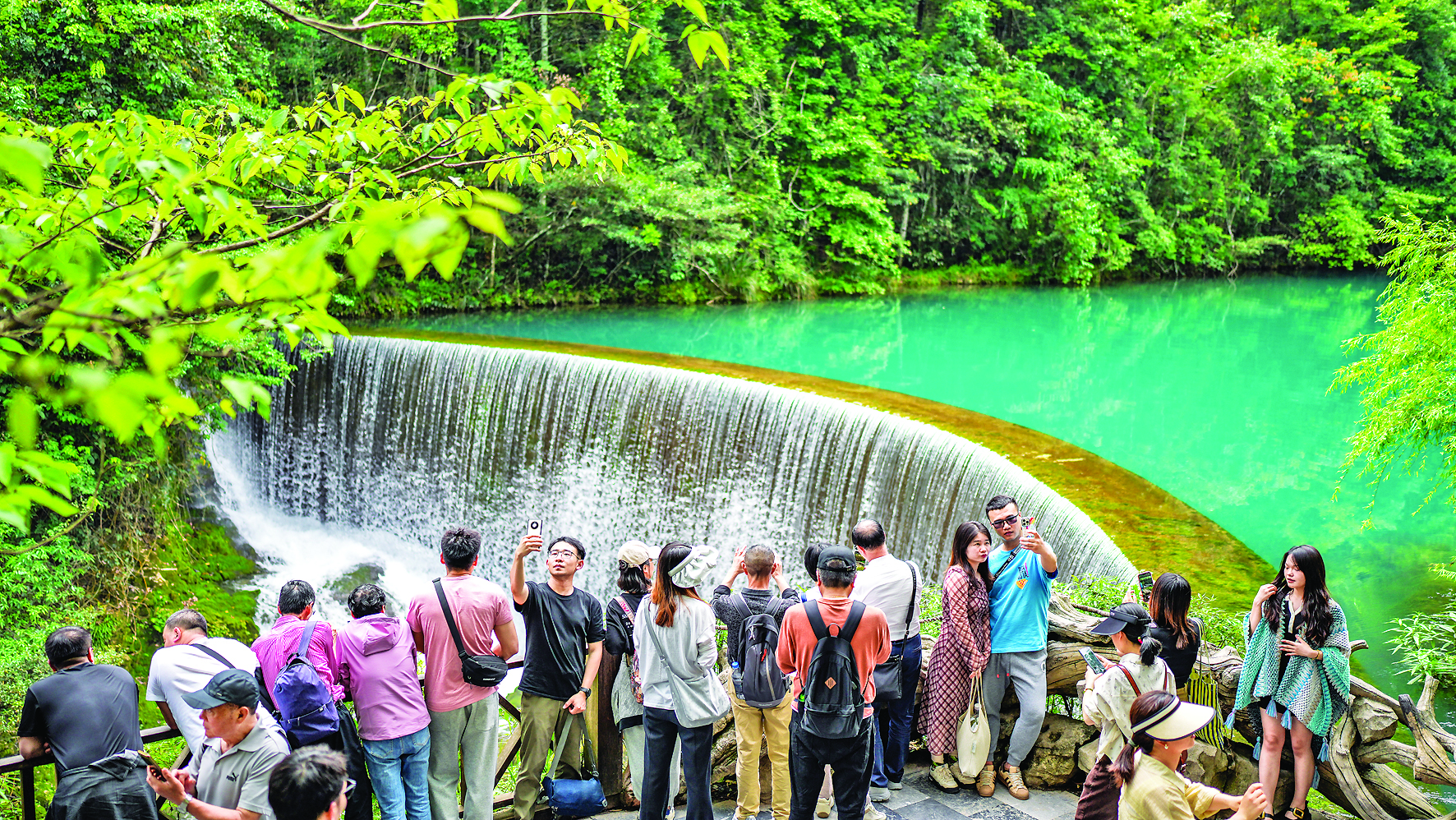 游客在贵州省黔南布依族苗族自治州荔波县的小七孔景区观光游玩(5月16日摄)。