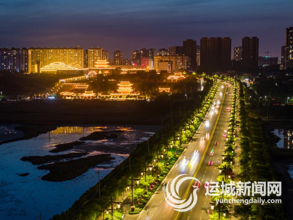 灯火通明的解放南路盐湖段与池神庙。