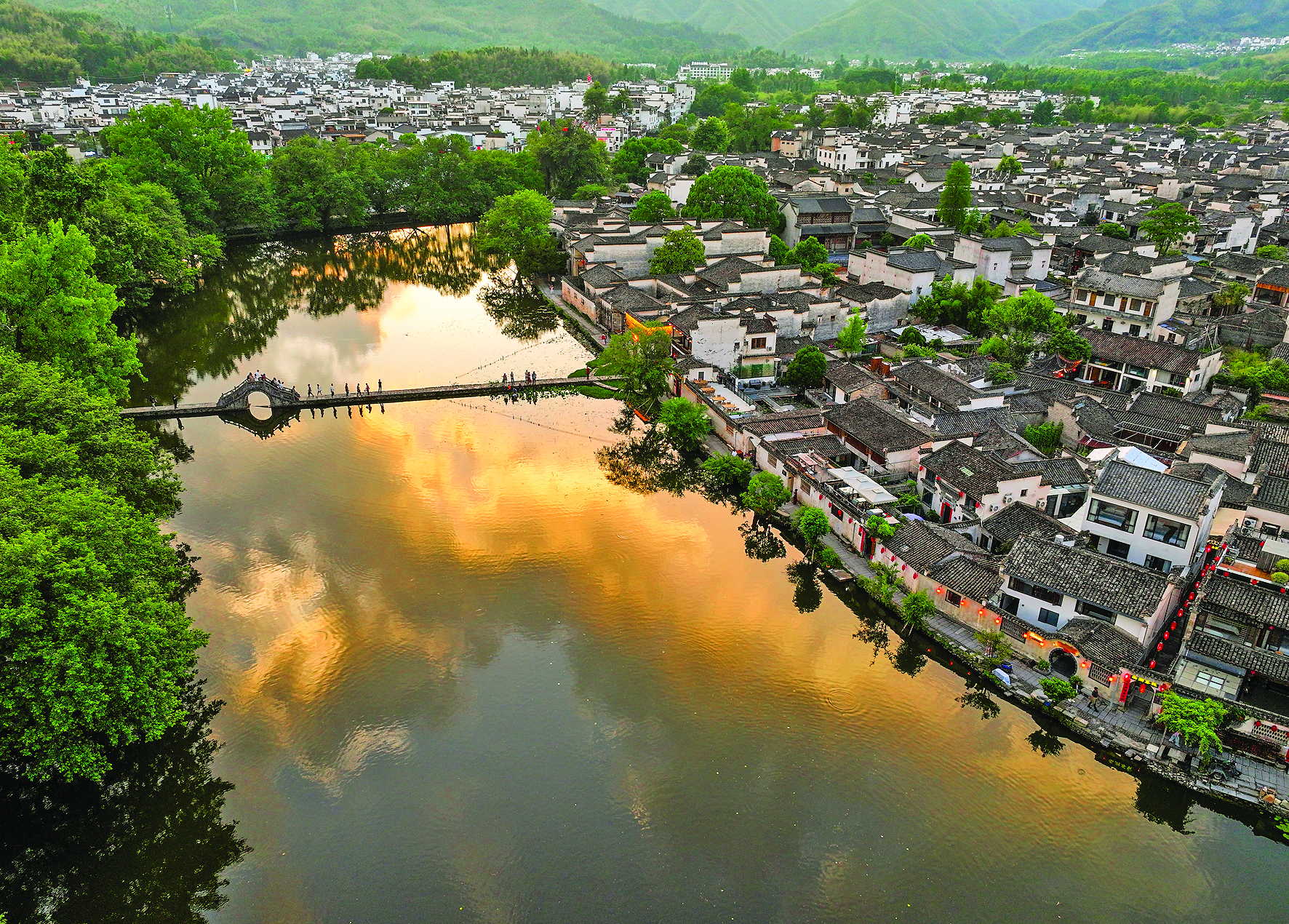 5月23日,晚霞倒映在黟县宏村南湖(无人机照片)。