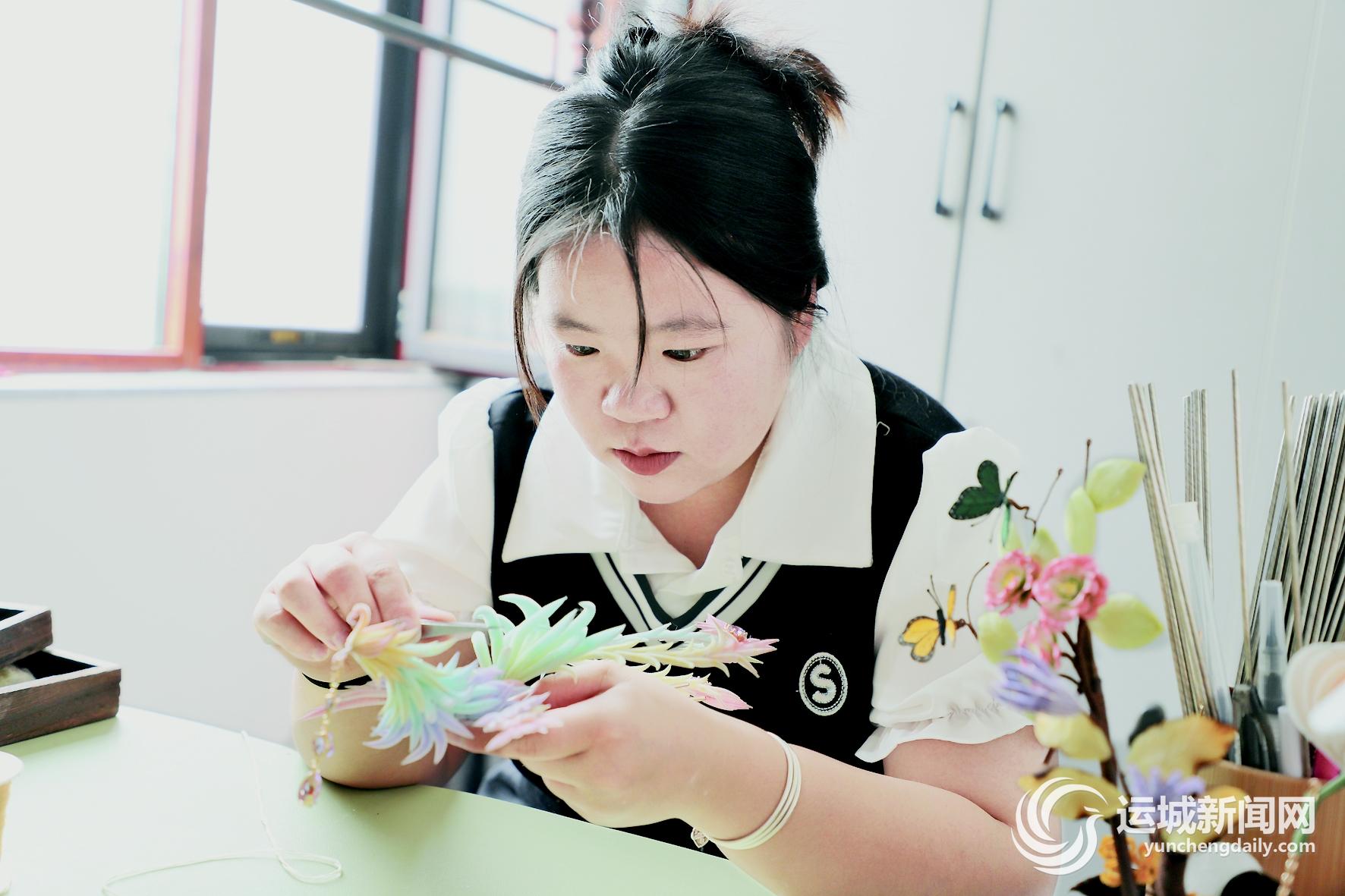 给学员们上课的老师,就是本次采访的主人公——“00后”女孩郭晶竹。这位刚从运城学院毕业的学生坚持绒花制作已有两年多,现已成立了自己的工作室,在淘宝、小红书等平台也开通了店铺,并通过微信朋友圈、短视频平台等渠道进行宣传推广。这次转向线下课堂,则是希望可以通过自己的力量,让更多人认识并喜欢上绒花。