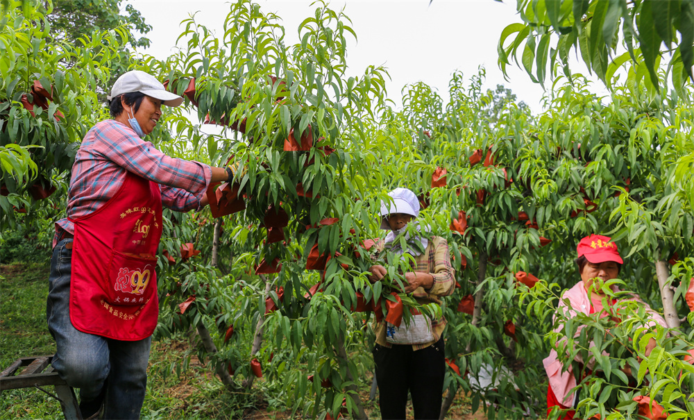 5月27日,夏县水头镇兴南村村民在给油桃套袋,提高果品品质。水头镇种植多个品种的油桃,已成为农民稳定增收的产业。