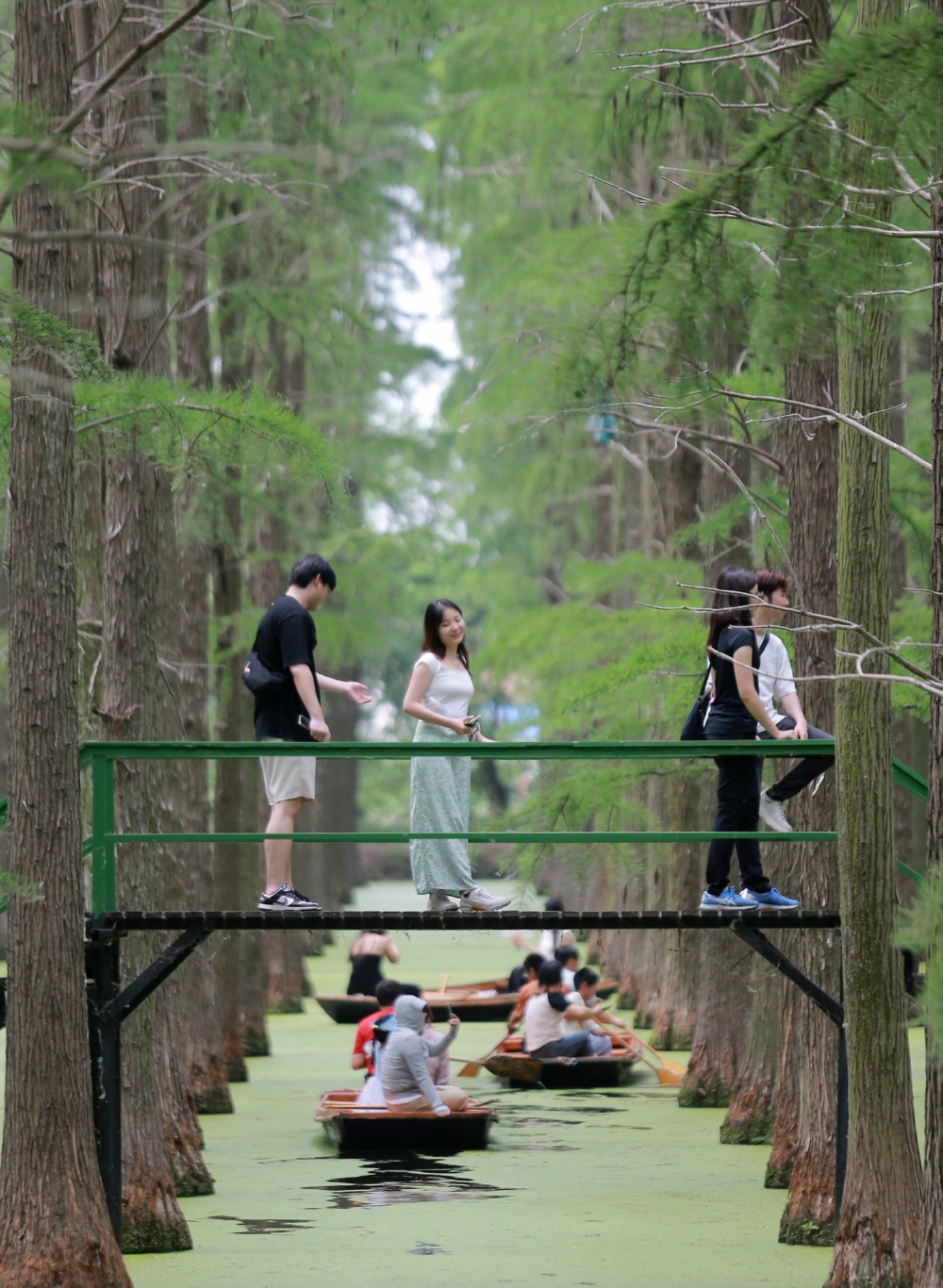 5月26日,游客在江苏省扬州市渌洋湖湿地公园的“水上森林”游玩。初夏时节,江苏省扬州市渌洋湖湿地公园内“水上森林”葱郁清凉,成为游客休闲避暑的好去处。 新华社发