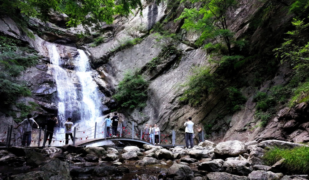 游客在西安太平国家森林公园游览(5月26日摄)。太平国家森林公园位于陕西西安鄠邑区太平峪内,地处秦岭终南山段,海拔880米~3000米。太平国家森林公园区域内高差悬殊、峭壁林立、峰峦叠嶂、沟谷连绵,多瀑布、急流和险滩,形成了丰富奇妙的山水自然景观。 新华社记者 刘潇 摄