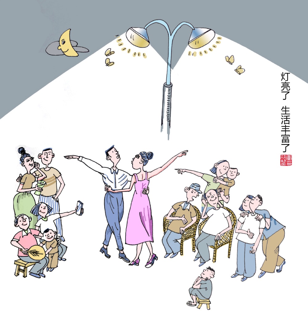 以前,大家不愿意晚上出门,装上新路灯后,居民们才有了这项新的“娱乐活动”。不用任何约定,大家吃过晚饭,没事就会默契地聚在一起,聊聊天、吹吹风,舒适又惬意。