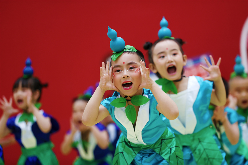 5月29日,重庆市黔江区妇联幼儿园的小朋友在表演情景剧《葫芦娃》。 新华社发(杨 敏 摄)
