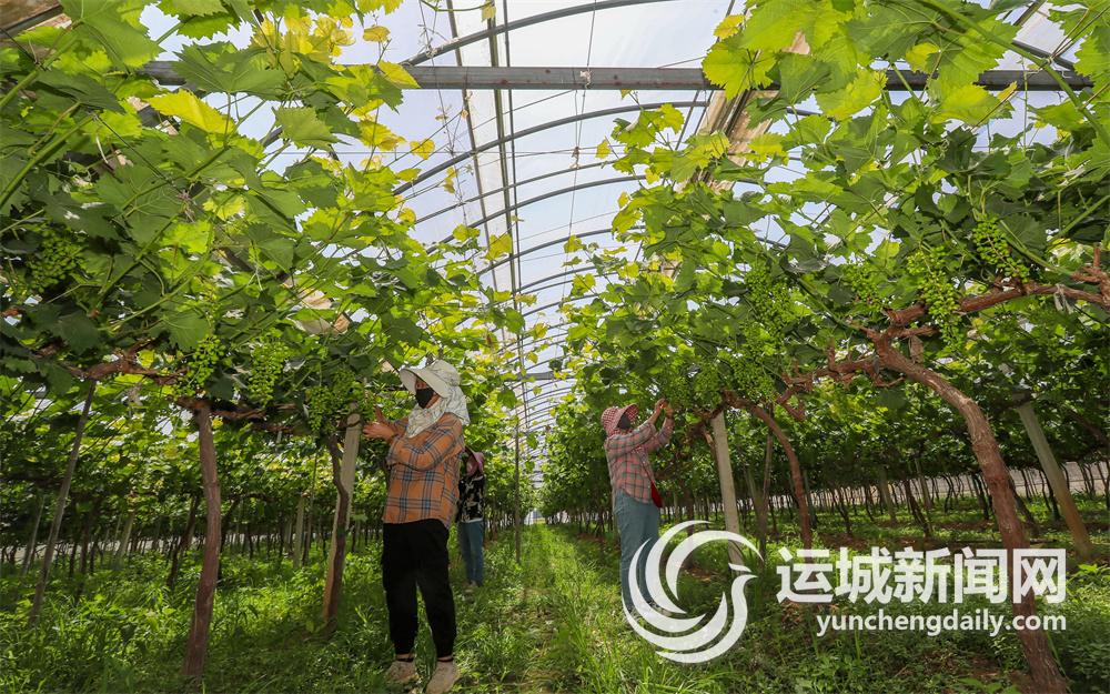 5月28日,夏县禹王乡禹王村的葡萄大棚内,果农在为葡萄疏果。