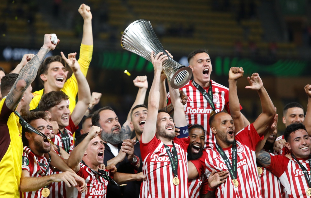 5月30日,奥林匹亚科斯队球员在颁奖仪式上庆祝。当日,在2023~2024赛季欧足联欧洲协会联赛决赛中,希超奥林匹亚科斯队1比0战胜意甲佛罗伦萨队,夺得冠军。