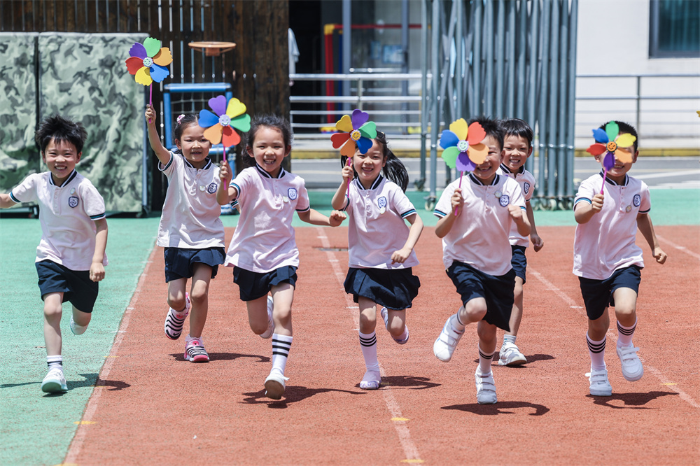 5月30日,余姚市凤山街道第二中心幼儿园的孩子们举着自己在“绿色低碳”课上制作的小风车参加赛跑。新华社记者 徐 昱 摄