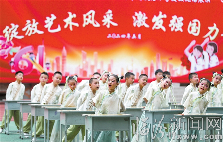 临汾新闻网讯 5月30日,临汾市解放路小学举办庆“六一”小学生艺术节展演活动,让孩子们在吟诗诵词中传承中华经典,在情景剧中展现文明礼仪,在节日中收获成长的快乐。图为该校“吟诵艺术亲子社团”学生正在吟诵《诗经》篇章。记者 闫锐鹏 摄