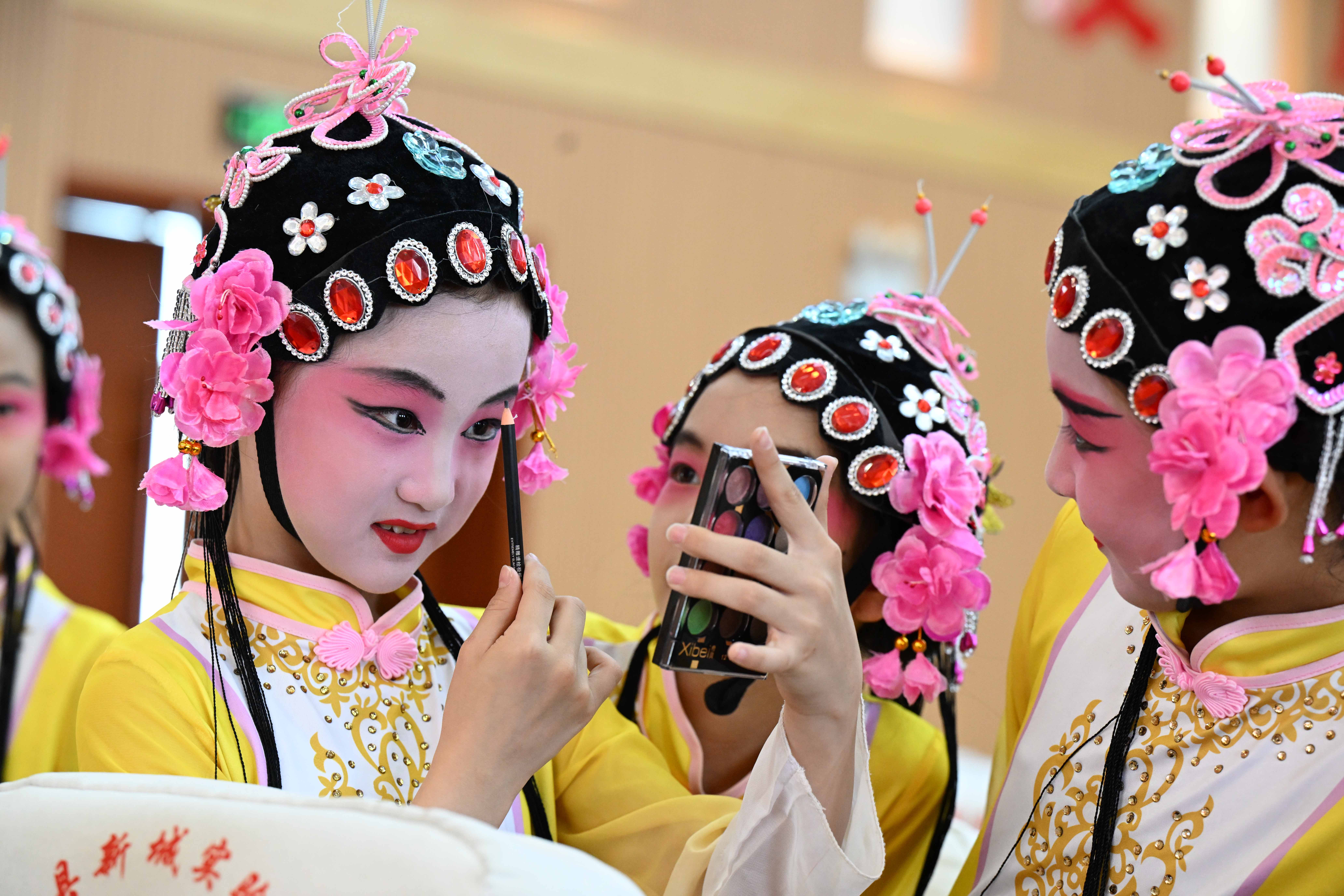 5月30日,在河北省石家庄市元氏县新城实验学校,小学生在表演节目前做准备。 新华社发(陈其保 摄)