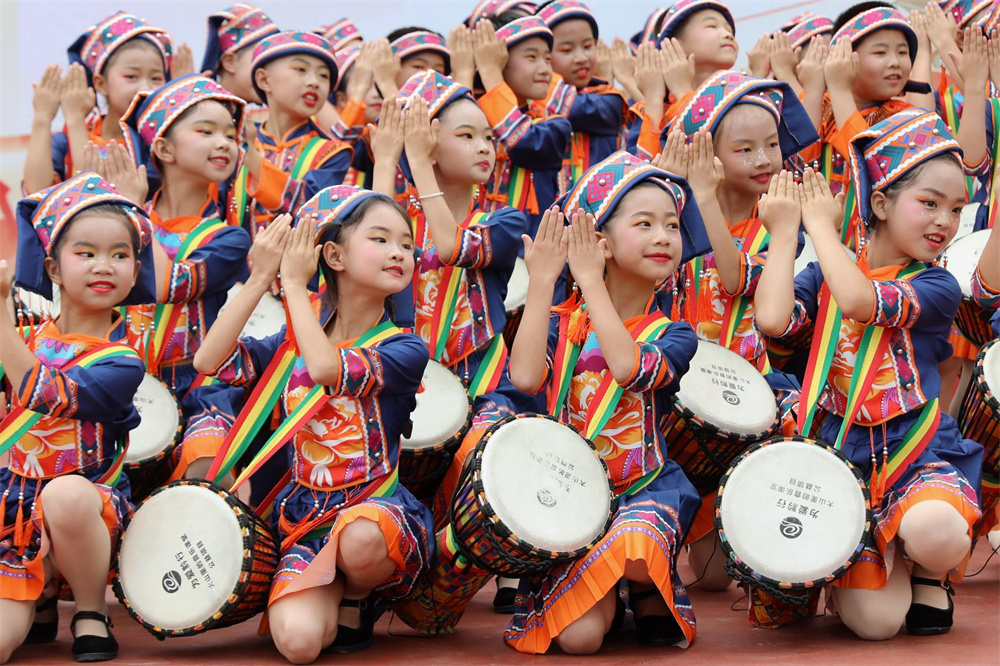 5月30日,贵州省黔东南苗族侗族自治州施秉县第四小学的学生在迎“六一”活动中表演节目。 新华社发(邰胜智 摄)