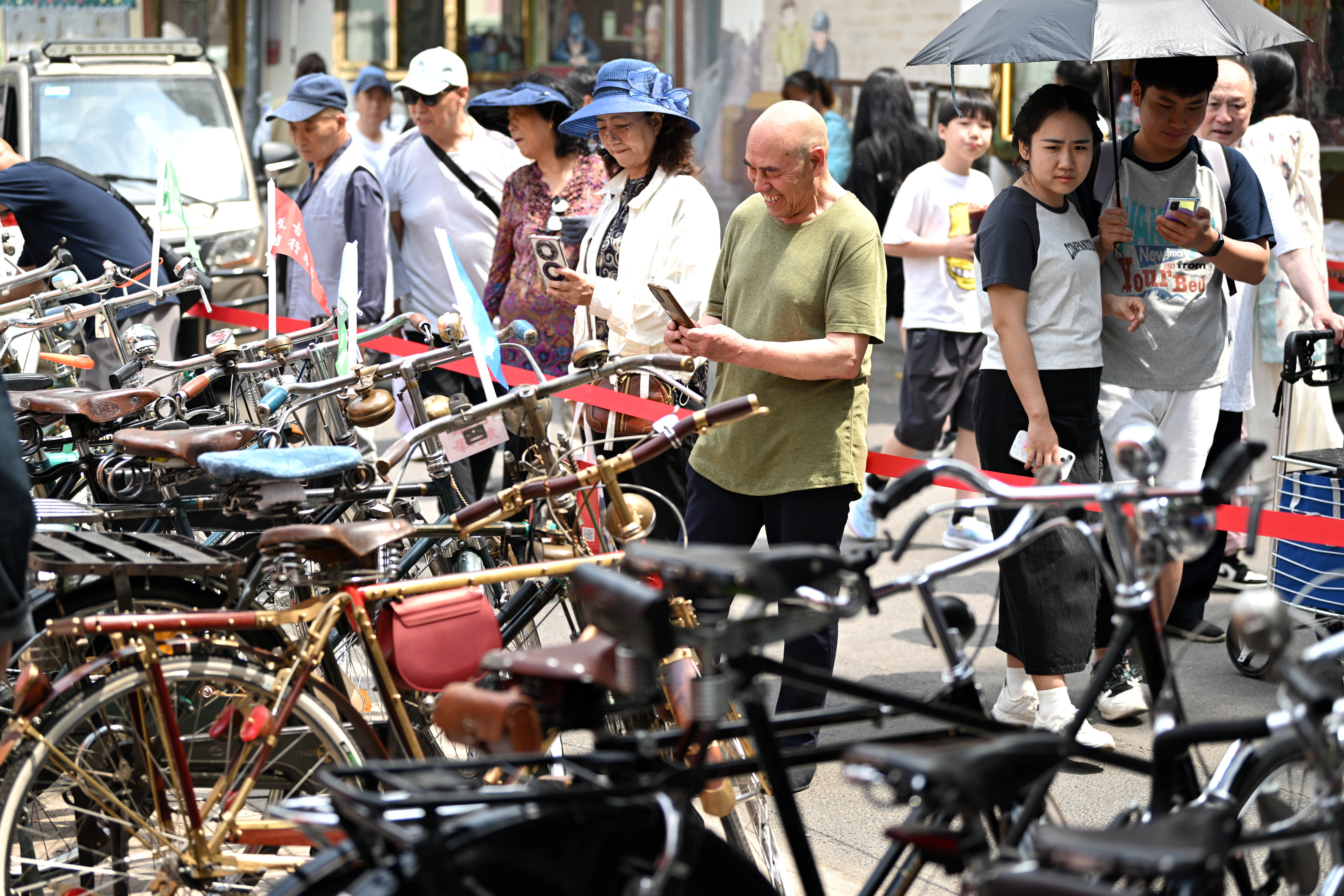 ▲6月2日,人们在参观复古自行车。当日,一场复古自行车展亮相天津市红桥区西北角特色街区。6月3日是世界自行车日。 新华社记者 李然 摄