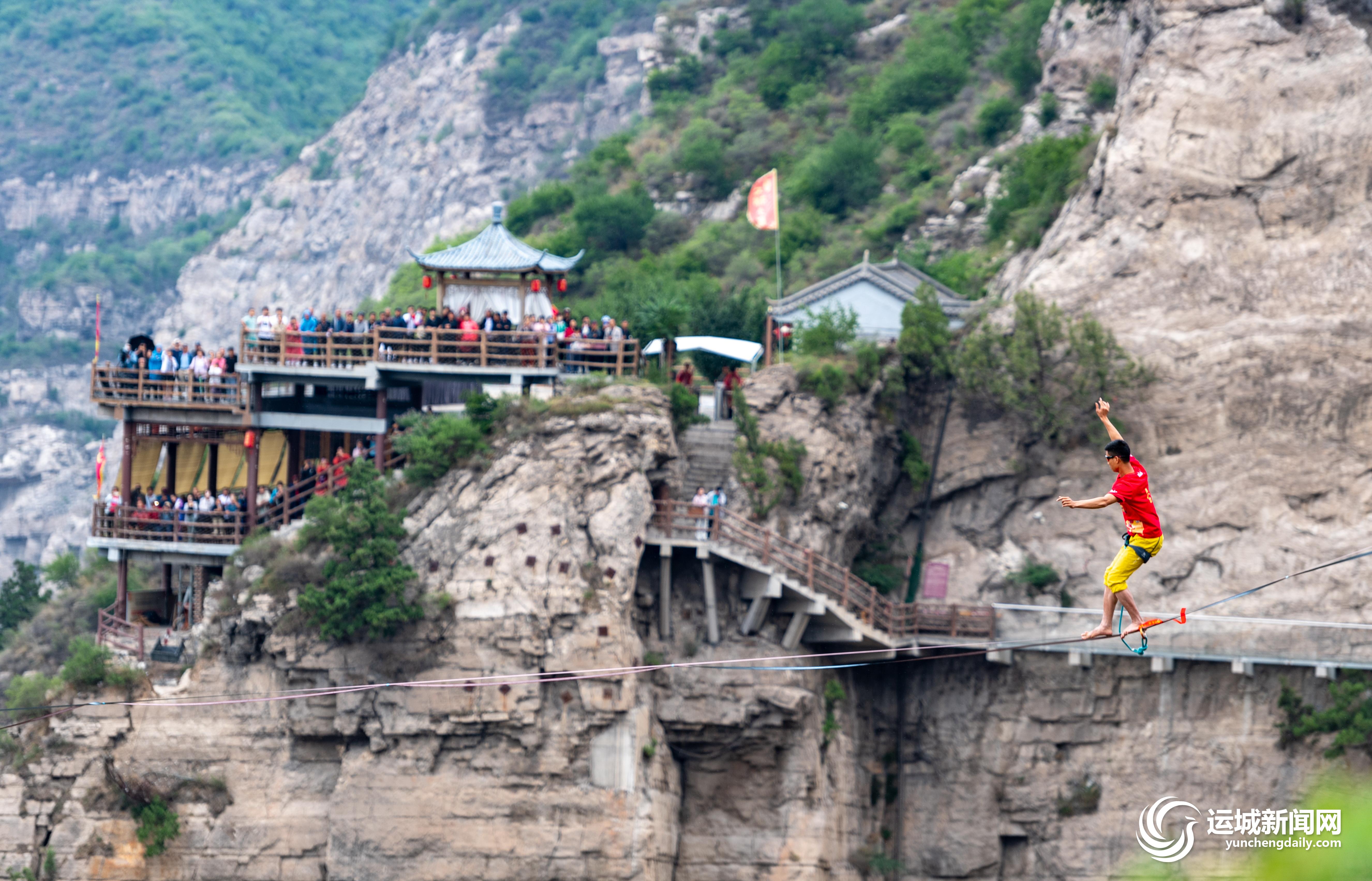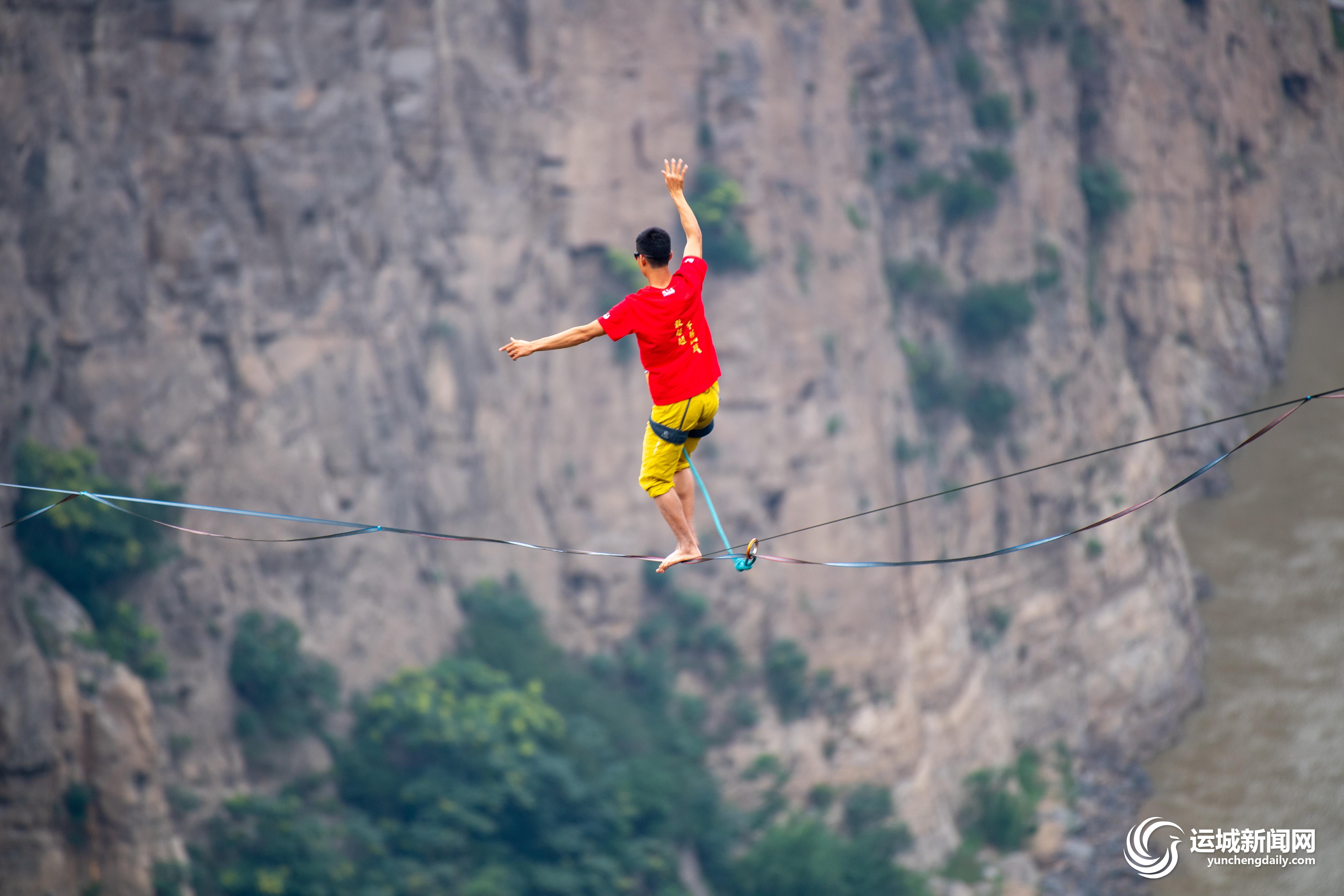 当天,“中国高空扁带第一人”施海林在长569米、高186米的赛道上横跨黄河两岸,从山西河津大梯子崖到陕西韩城桑树坪,挑战其本人保持的亚洲最长高空扁带行走纪录,并挑战成功。
