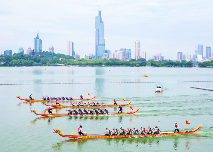 6月2日,龙舟选手在江苏南京玄武湖上竞渡(无人机照片)。