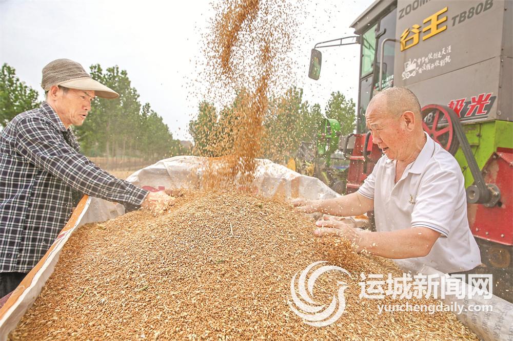 地处汾河岸畔的稷山县上费村小麦喜获丰收,河滩水浇地亩产达600公斤。图为6月3日,农户抢收小麦。特约摄影 史云平 摄