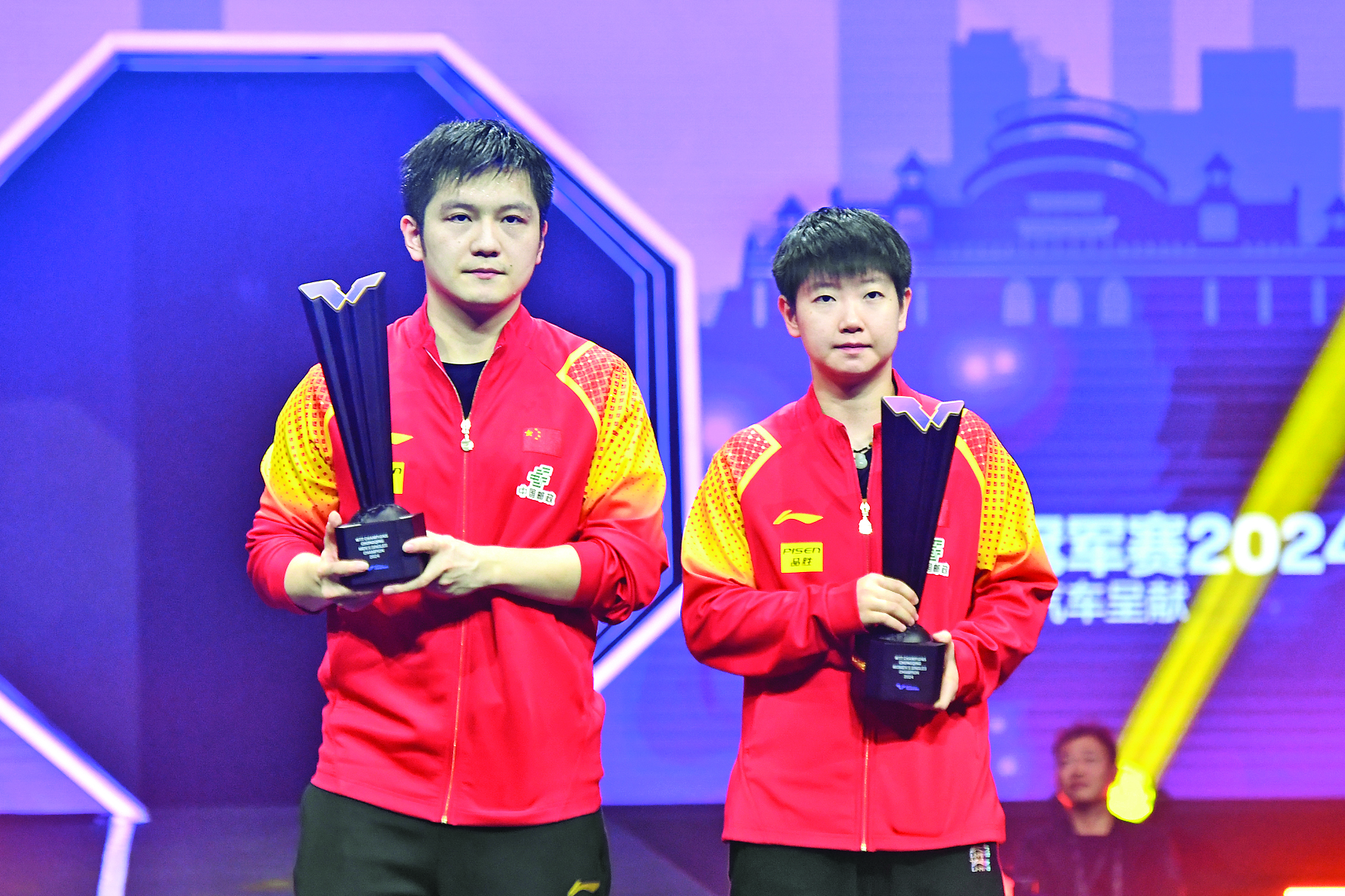 6月3日,男单冠军中国选手樊振东(左)与女单冠军中国选手孙颖莎在颁奖仪式上合影。