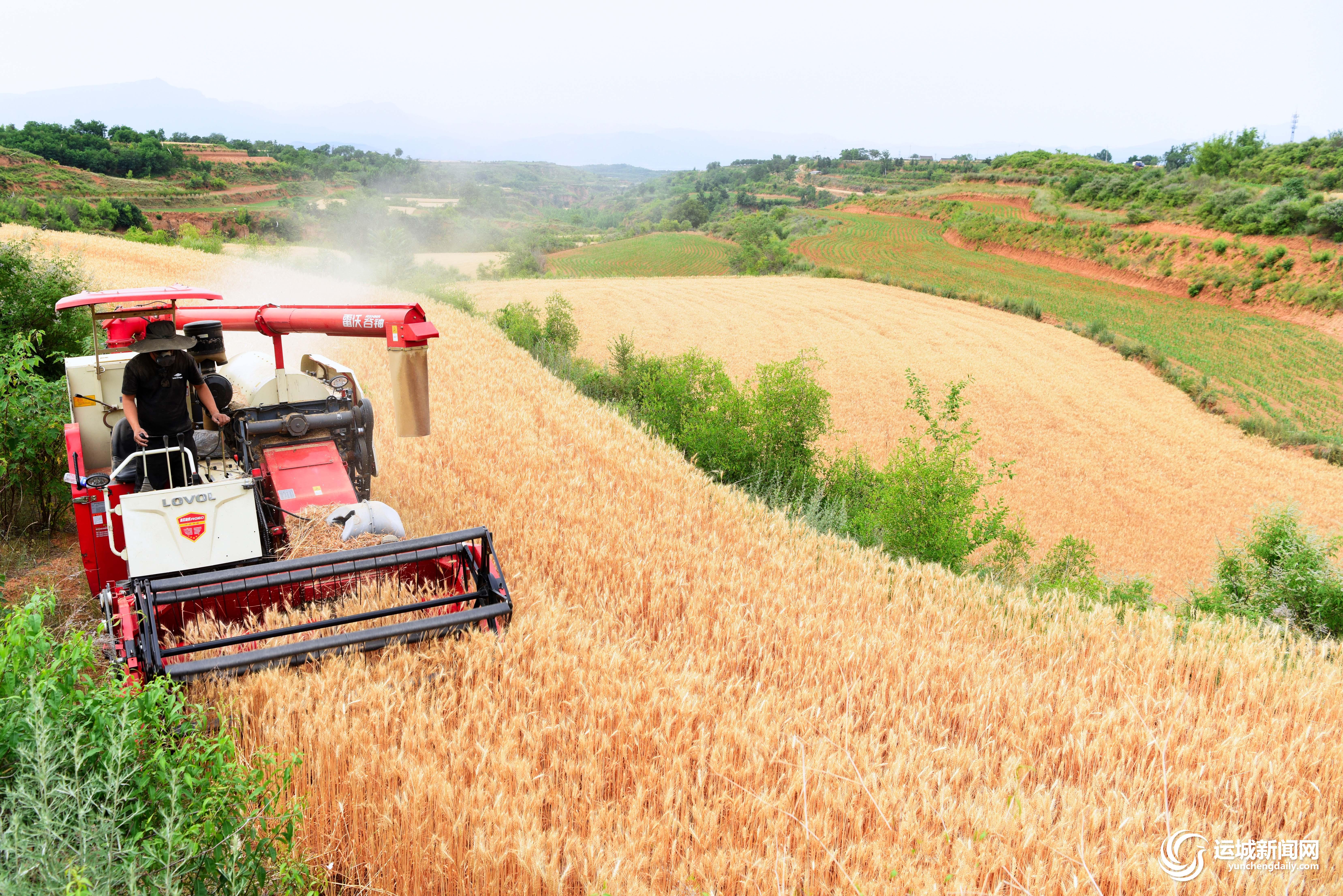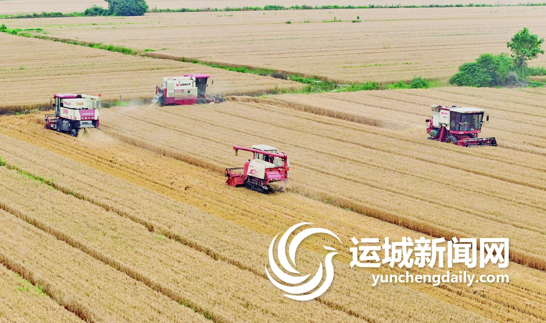 来到芮城县东垆乡,一块块麦田铺在黄河岸畔,微风拂过,金色的田野泛起涟漪,黄河水低声吟唱,麦穗在风中摇曳附和,天地间都在为即将到来的丰收庆典蓄力。不知不觉间全县的小麦由南向北、由西向东全面进入了收获期,收割机械的轰鸣声拉开了小麦大规模机收作业的序幕。风陵渡镇西王村种粮大户姚国伟的麦田里,6台大马力收割机来回穿梭,一簇簇成熟的麦穗顺着传送带进入收割机仓,同时,玉米播种机也在田间蓄势待发,收割、播种和植保等作业一气呵成。