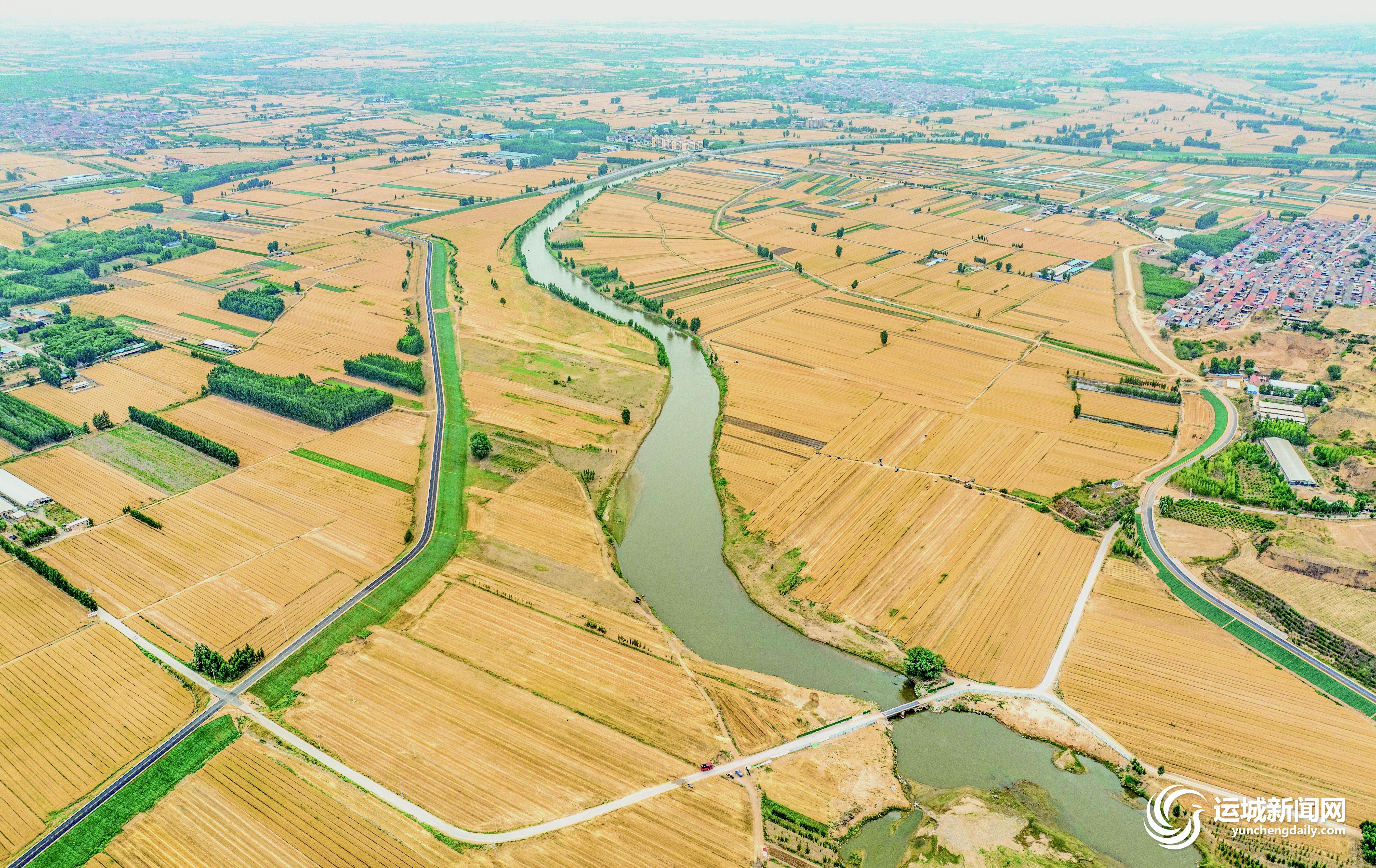 汾河蜿蜒,见证着河东大地的金色奇迹。麦子收获的季节,沉甸甸的麦穗是对农民最好的馈赠。稷山县汾河湾,饱满的麦穗压弯了麦秆,和着六月带着暖意的风,在空气中氤氲出阵阵麦香,金色的麦田与绿色的林带相互交织,黄绿交错,织出一幅美丽的田园风光图;河津市黄汾百万亩粮食优质高产高效示范基地,大地铺金,明亮亮的黄色摄人心魄,宛如银带的汾河贯穿其中,列车驶过麦田,与整齐的村庄交相辉映,好一个丰收在望的美丽景象。