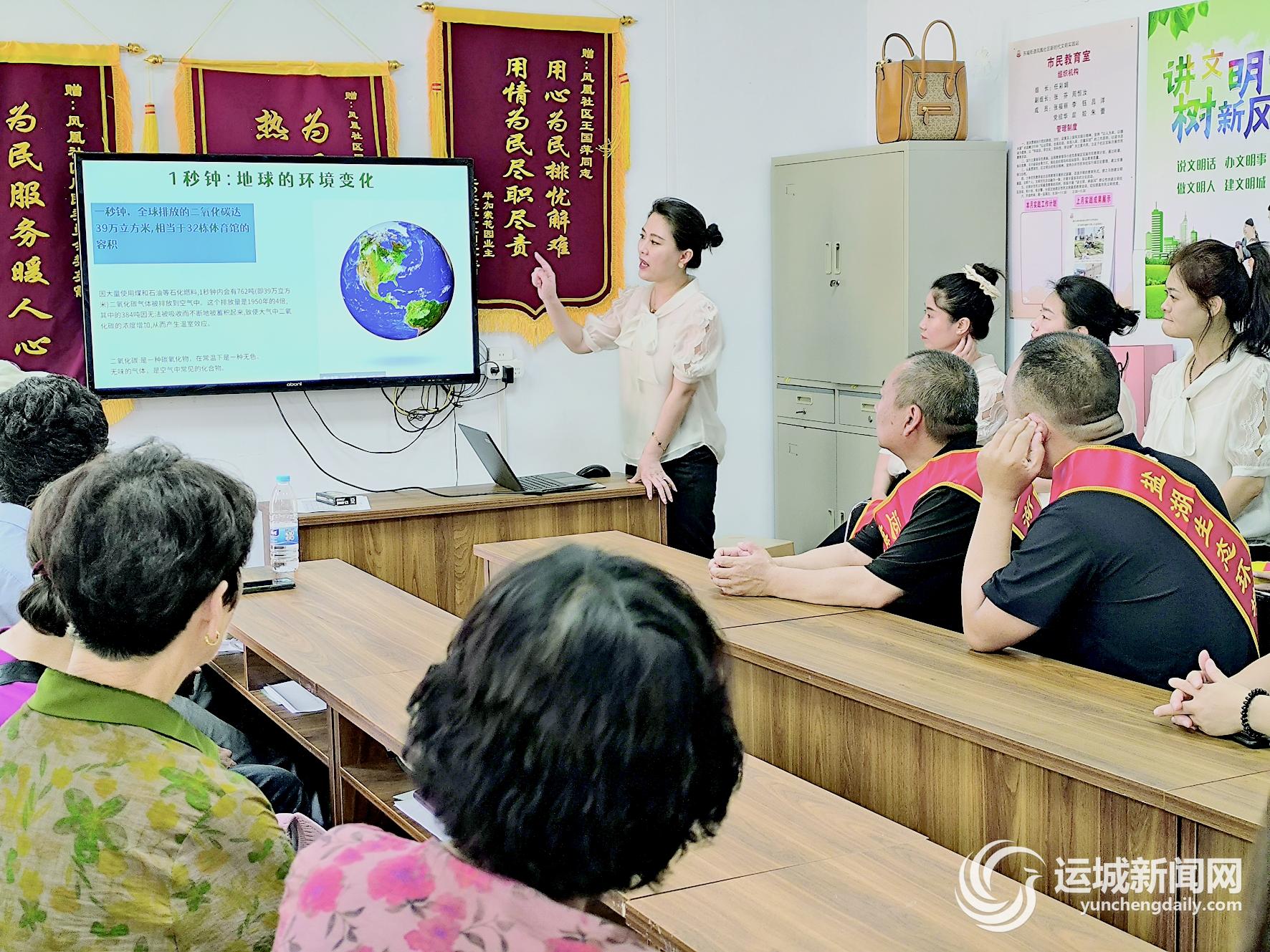 “拒绝奢侈浪费,践行光盘行动,节约用水用电用气,选用高能效家电、节水型器具,一水多用,合理设定空调温度,及时关闭电器电源,纸张双面利用……”讲座中,市生态环境局盐湖分局工作人员分享了日常环保行为,并讲解了1秒钟地球的环境变化、环境污染的种类等知识,引发居民深入思考、积极讨论。