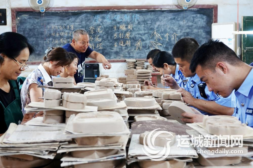 6月6日,中国绛州澄泥砚文化产业园制砚工艺师为民辅警介绍绛州澄泥砚制作技艺。
