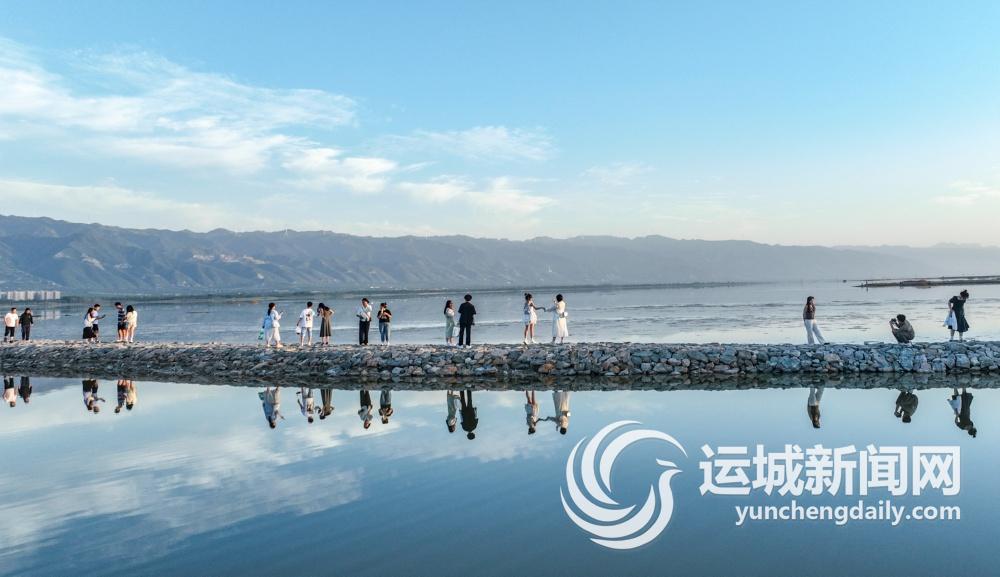 6月9日,七彩盐湖景区游人如织,蓝天、白云、落日、盐湖与游客构成一幅美丽画卷,游客们置身其中,宛如穿梭在天空之境,乐享端午假期。