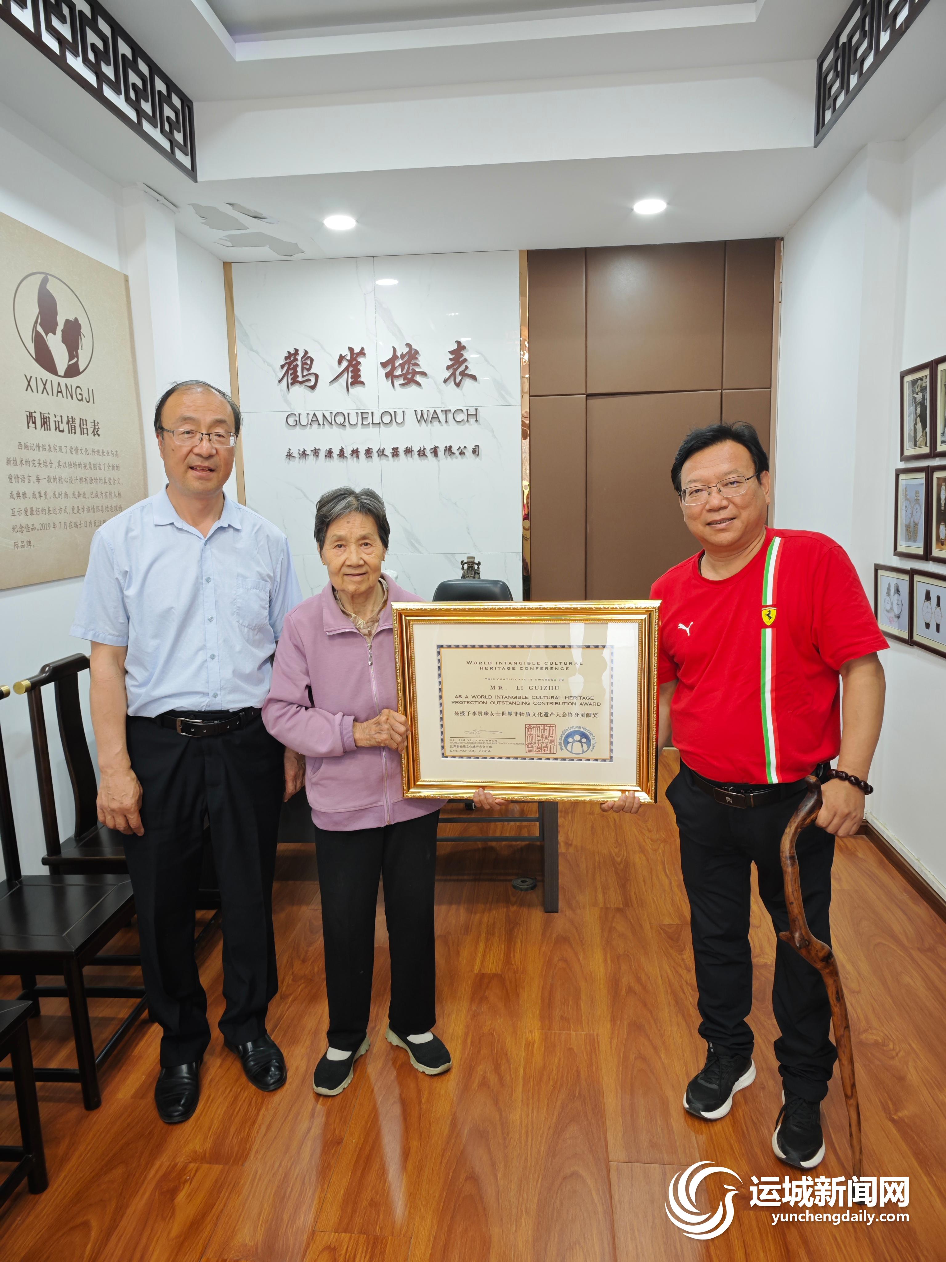 运城晚报讯(记者 李婉玉)6月6日,世界非遗大会执行主席朱英华来到运城,为市级非遗钟表制作与修复技艺传承人李贵珠及其子黄建平分别颁发世界非物质文化遗产大会终身贡献奖(下图)、世界非物质文化遗产大会传承大奖。