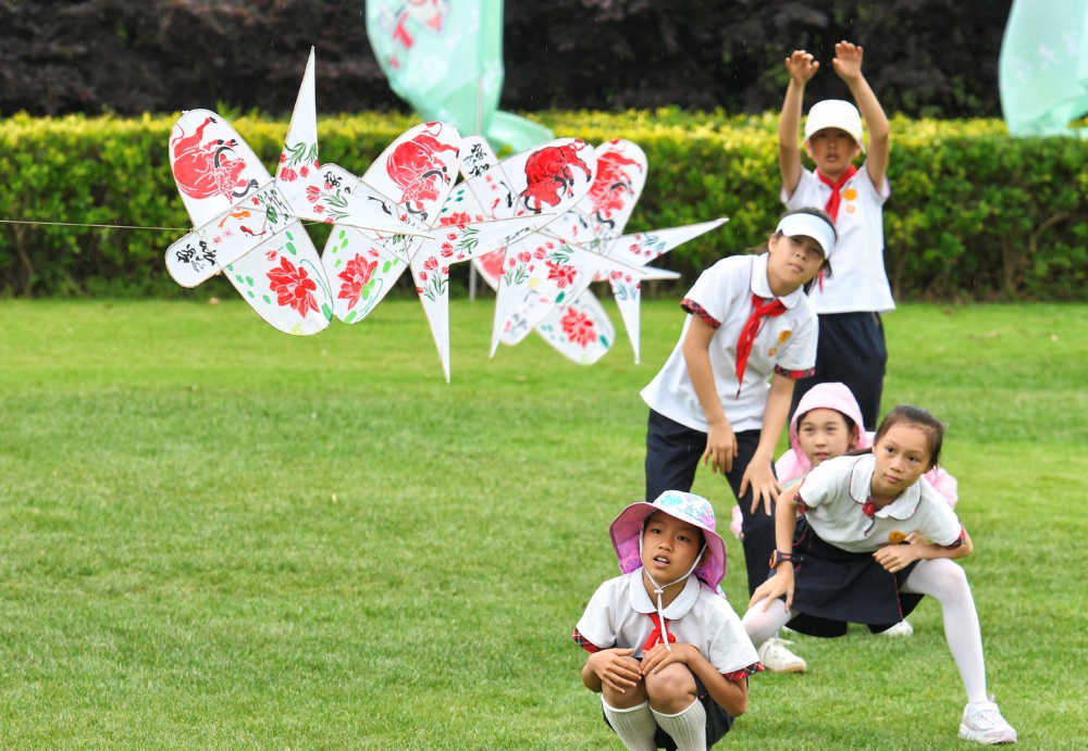 6月10日,参赛选手在风筝赛小学组的比赛中。