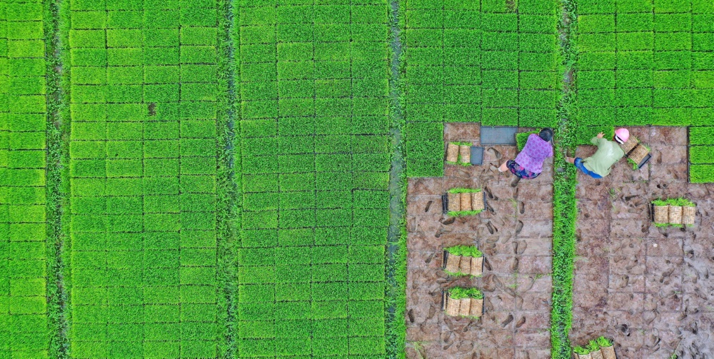 6月9日,浙江省台州市仙居县双庙乡农民在起运秧苗,准备插秧(无人机照片)。