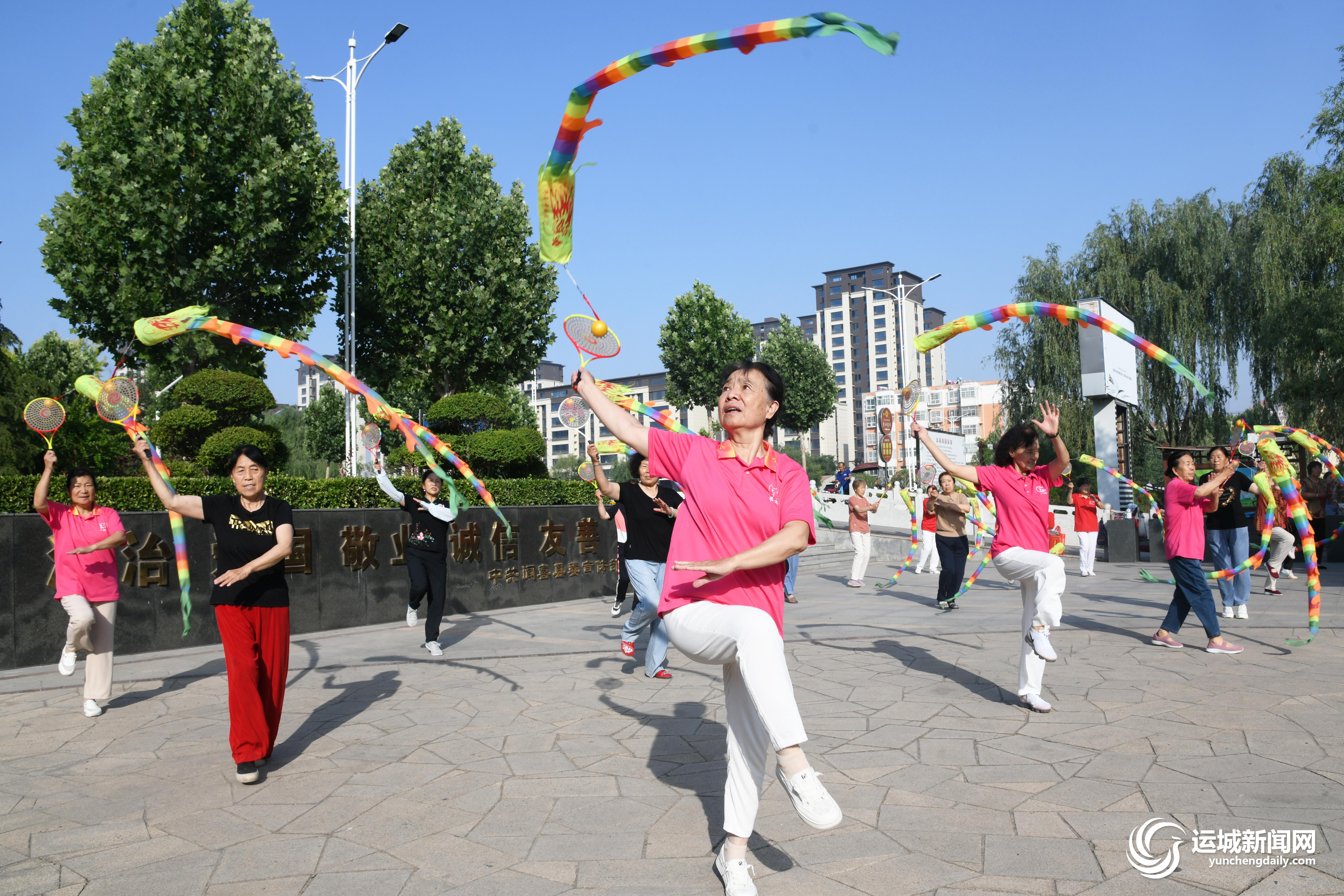 6月12日,闻喜县涑水柔力球队队员们在该县涑水公园进行柔力球晨练。