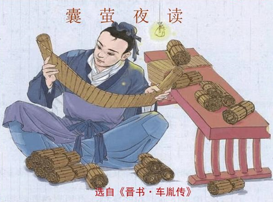 囊萤照读。用口袋装萤火虫,照着读书。形容家境贫寒,勤苦读书。出自《晋书·车胤传》:“车胤恭勤不倦,博学多通,家贫不常得油,夏月则练囊盛数十萤火以照书,以夜继日焉。”这个成语说的是,晋代的车胤小时候好学不倦,因家贫没钱买灯油供他晚上读书。但车胤不愿浪费晚上的读书时间,就寻找照明的办法。在一个夏日的夜晚,他见室外到处飞舞着萤火虫,就用白纱布袋把捉来的几十只萤火虫吊在书本的上方,借着微弱的光线读书,最后终于成才。