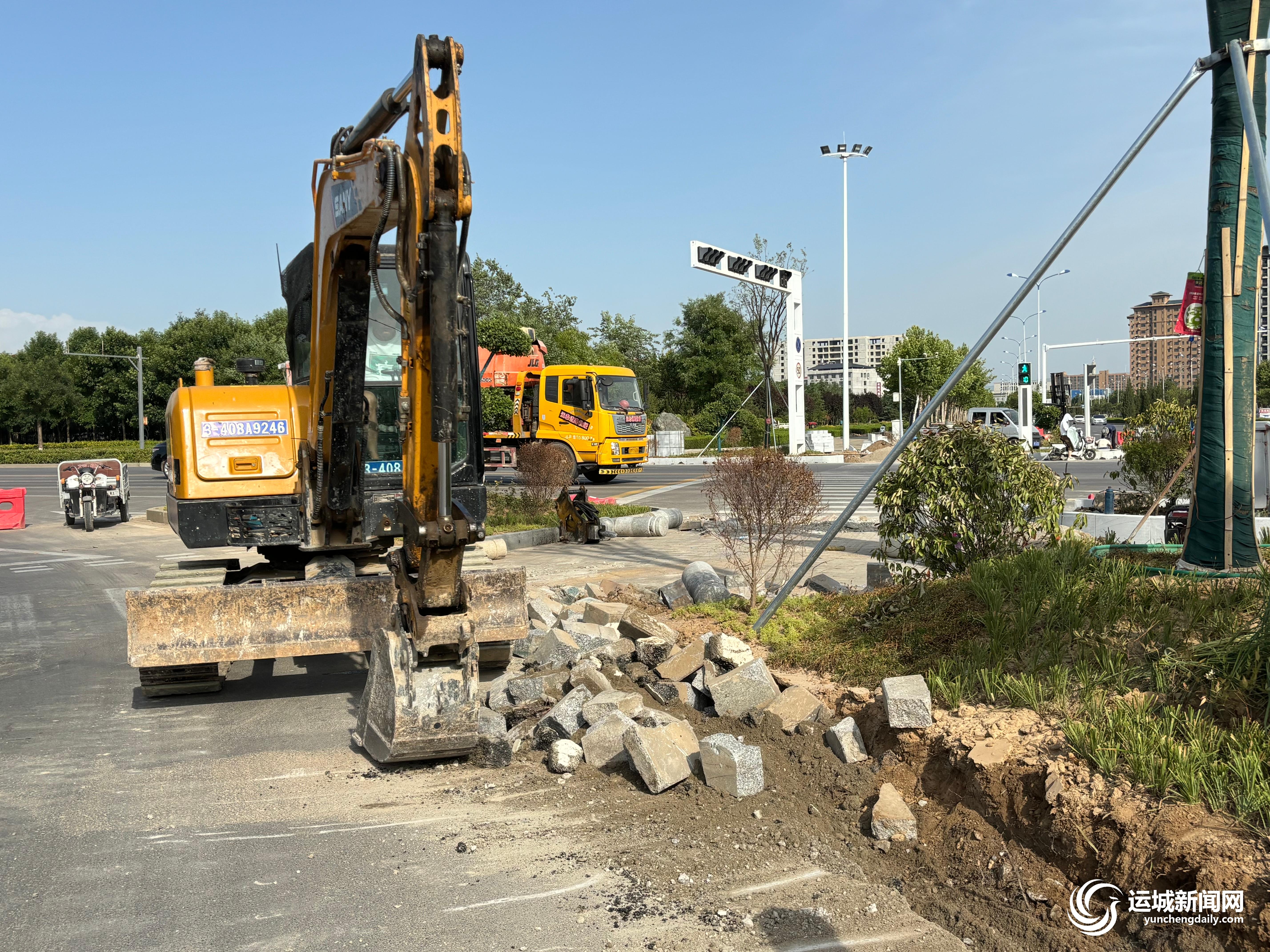 6月12日下午,走进大禹街东延道路可以看到,主车道已经实现通车,整个路面平整开阔、干净整洁,道路标识、标线清晰。道路中间设置了绿化带,还配备了公交车专用车道和路灯。在市区安邑西路和大禹街交叉口处,几名施工人员正加紧对路口的渠化岛进行拓宽改造,提升过路行人、非机动车容量。