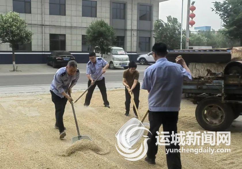 运城晚报讯(记者 樊朋展)“太谢谢你们了,这才一会儿工夫就帮我收完了麦子,心里踏实了。”6月11日,河津市赵家庄街道粮农在河津市公安局赵家庄派出所民辅警帮助其收麦后激动地表示。当天,该所值班民警在收到群众求助后,立即动身,帮助粮农收回了晾晒的庄稼(下图)。