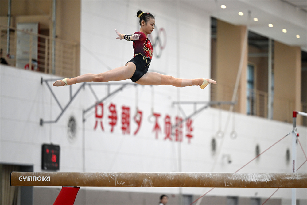 6月12日,中国体操队队员邱祺缘在平衡木比赛中。她以总分56.331的成绩获得女子个人全能第一名。