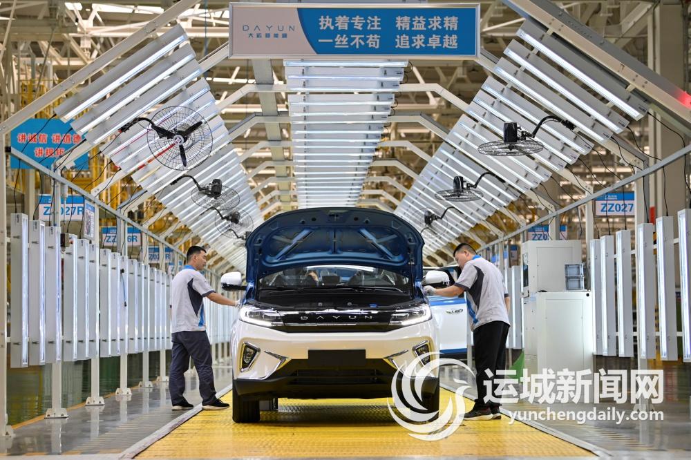 6月13日,在位于运城经济技术开发区的大运新能源汽车生产基地,工人对新能源汽车进行下线前的检测。