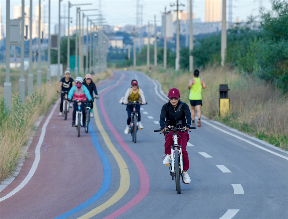 6月5日,人们在运城盐湖环湖步道上骑行。