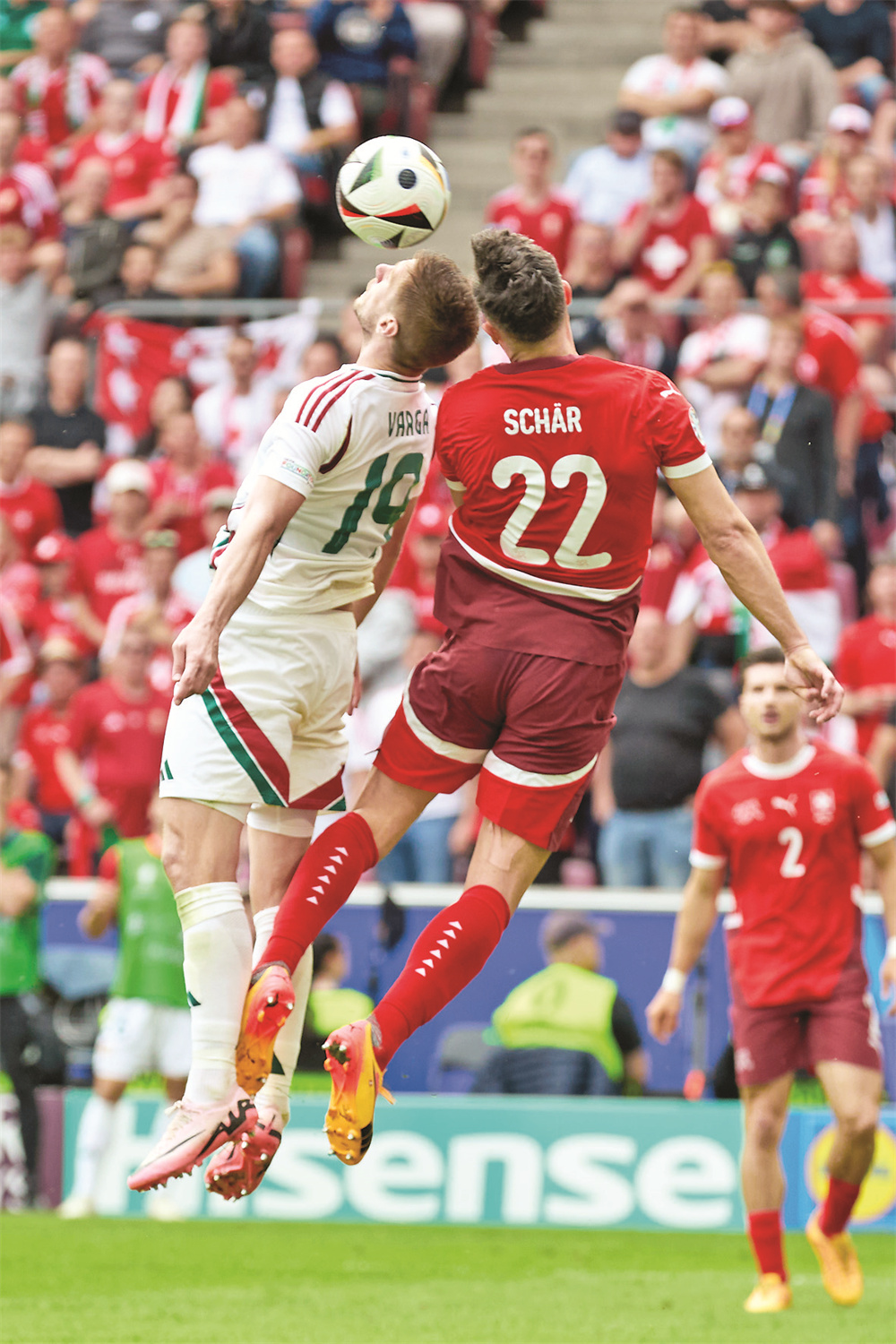 6月15日,匈牙利队球员沃尔高(左)和瑞士队球员舍尔在比赛中争顶。