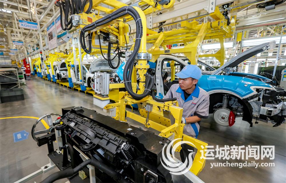 在大运新能源汽车总装车间内,技术工人正在组装新能源汽车,确保订单高质量如期交付。