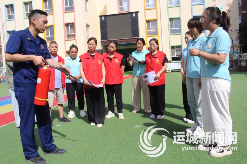 近日,在闻喜县三一社区一幼儿园内,该县消防救援大队消防人员向社区工作人员、幼儿园老师示范如何操作灭火器进行灭火。