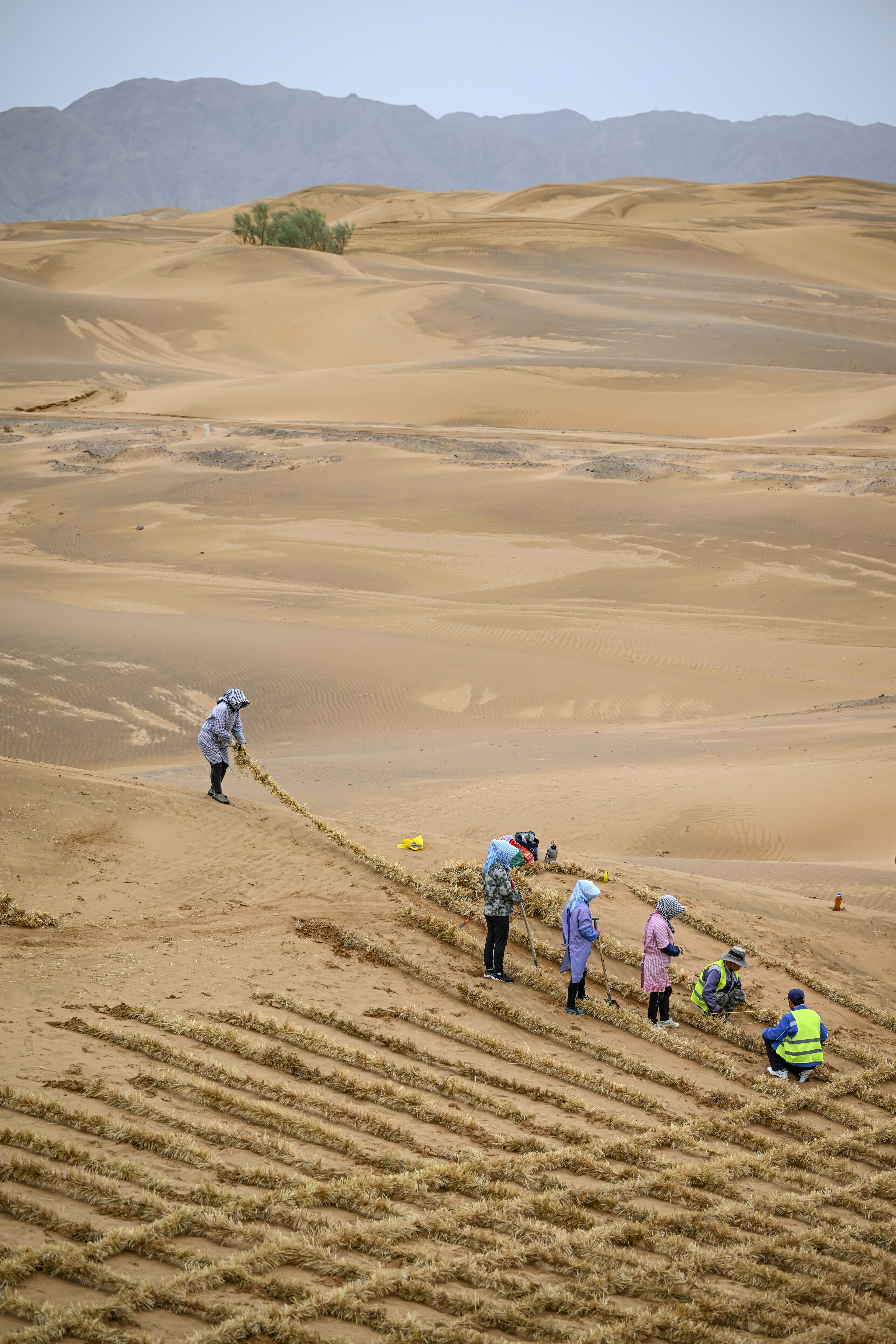 治沙工人在宁夏中卫市境内的腾格里沙漠铺设刷状网绳式草方格沙障(5月29日摄)。 新华社记者 冯开华 摄
