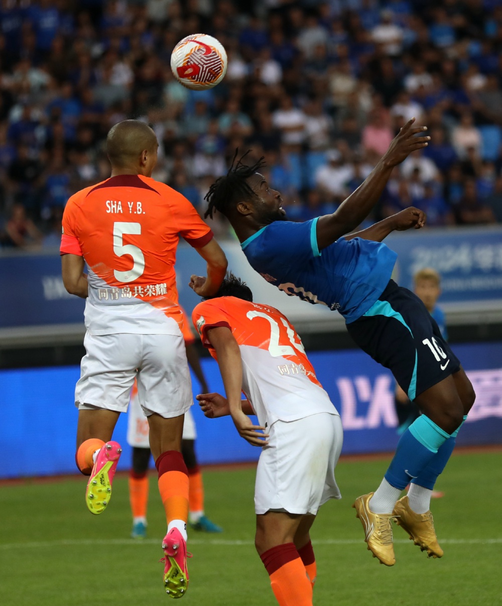 6月16日,青岛海牛队球员沙一博(左)与沧州雄狮队球员奥斯卡(右)在比赛中争顶。