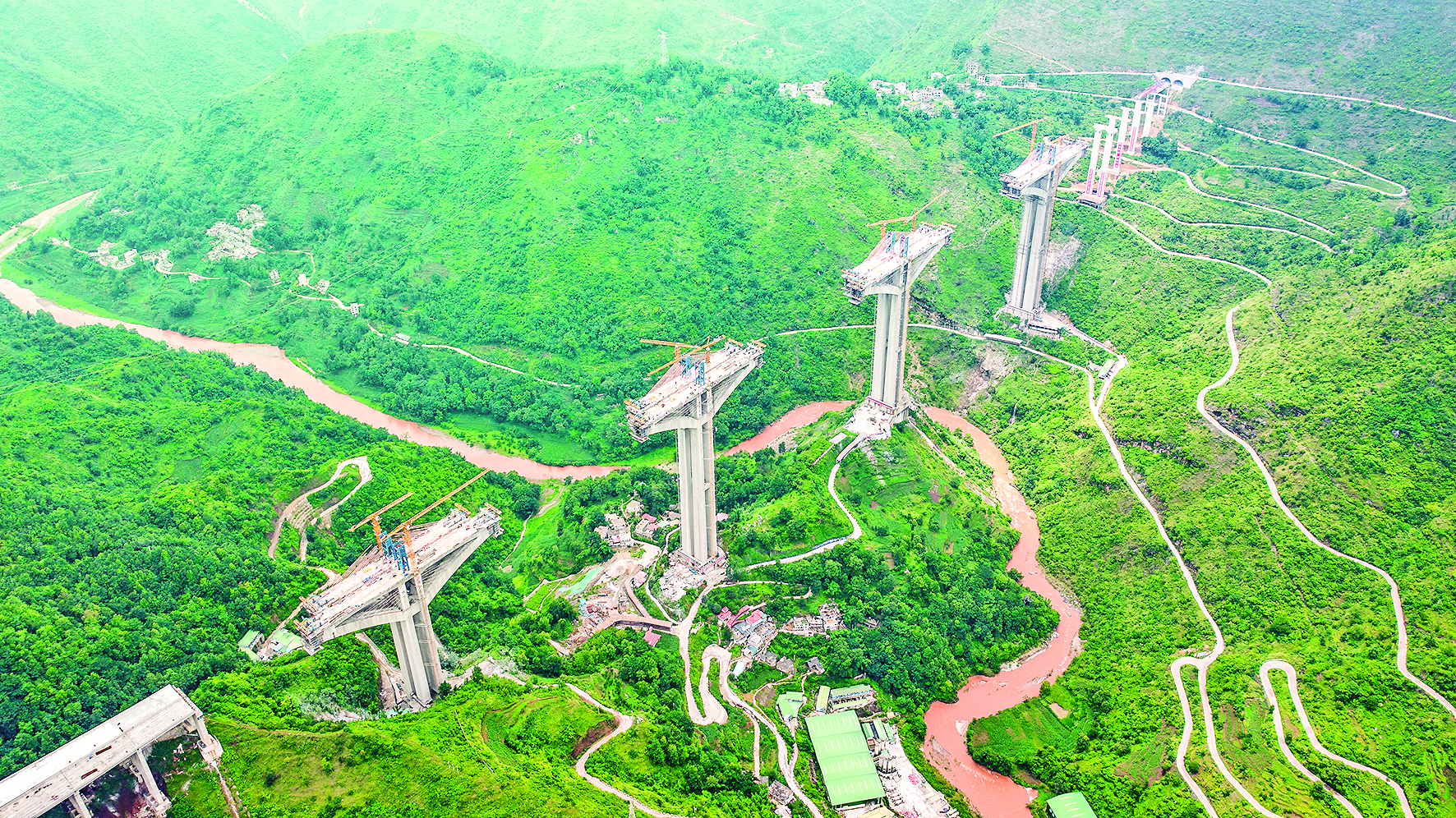 这是建设中的六枝特大桥桥墩(无人机照片,6月17日摄)。