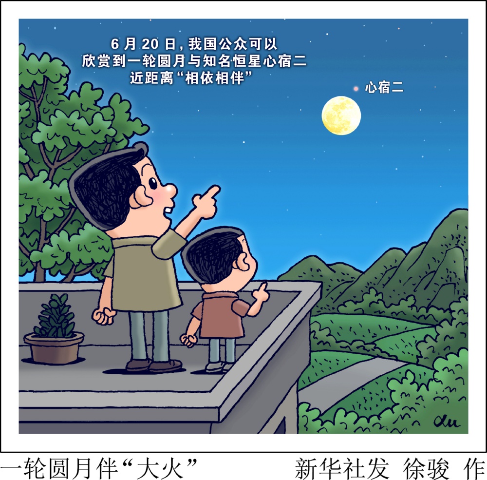 6月20日,如果天气晴好,我国公众几乎整夜可以欣赏到这样一幕天象:一轮圆月与知名恒星心宿二近距离“相依相伴”。 新华社发 徐骏 作
