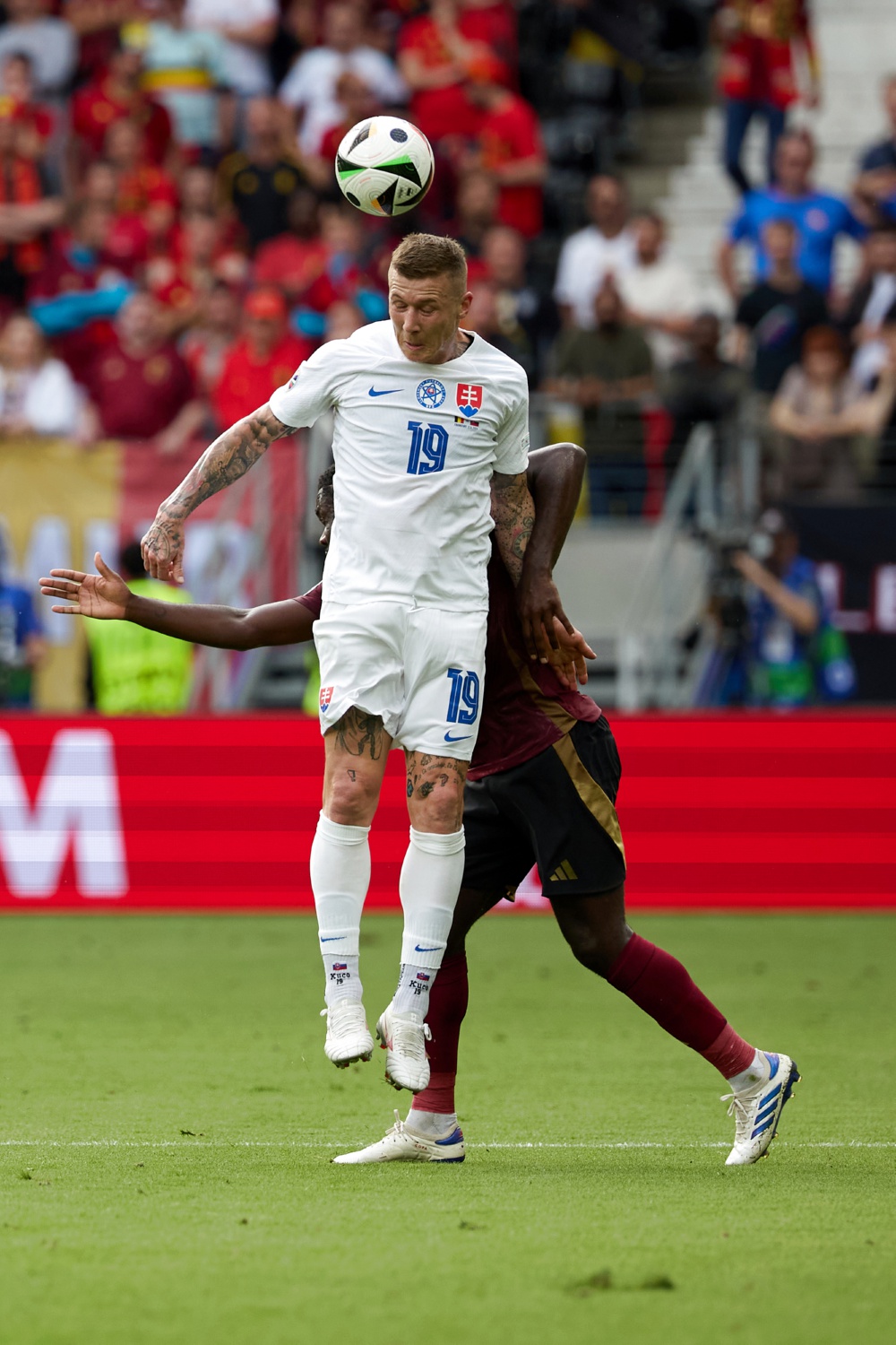 6月17日,斯洛伐克队球员库茨卡(上)在比赛中争顶。