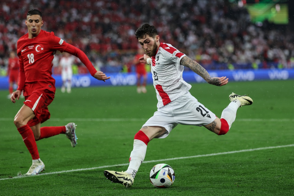 6月18日,格鲁吉亚队球员乔治·齐塔什维利在比赛中射门。