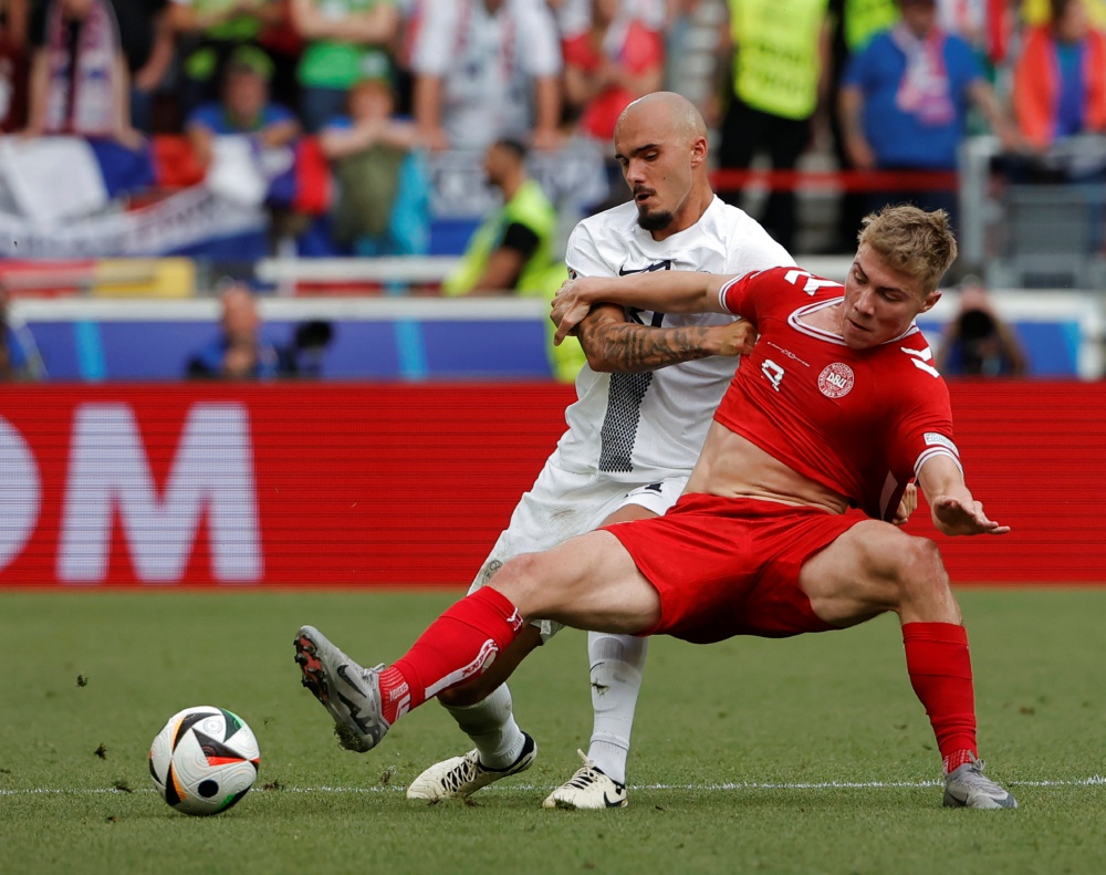 6月16日,斯洛文尼亚队球员德尔库西奇(左)和丹麦队球员拉斯穆斯·霍伊伦德在比赛中拼抢。