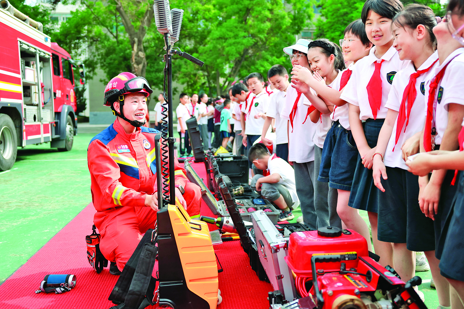 6月19日,甘肃省兰州市消防救援支队指战员在兰州市东郊学校为学生介绍消防器材装备。